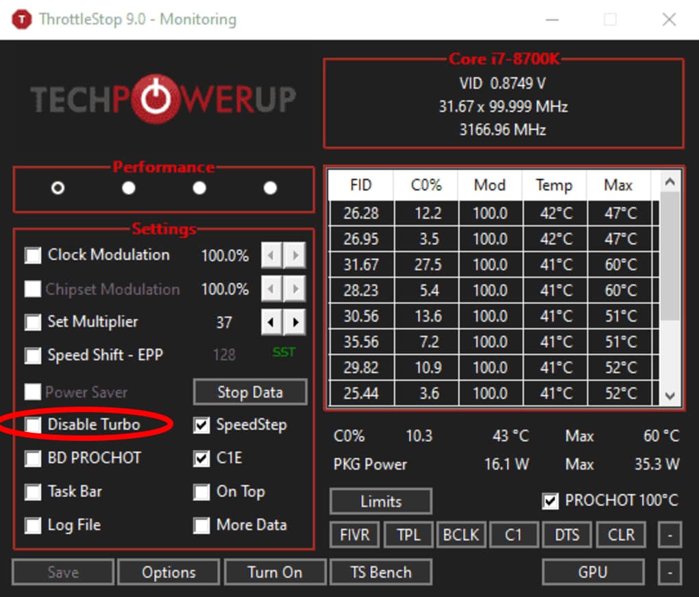 I just realised you can also achieve the same turbo vs non-turbo test by changing your Windows power plan between high performance and power saver if you don’t want to install throttlestop. I use PowerPoint switcher to do this with an icon on my task bar for my 5800x3d and it works great. eg. power saver down clocks my CPU to 3.3GHz, as circled in red, vs 4.5 GHz normal turbo boost.