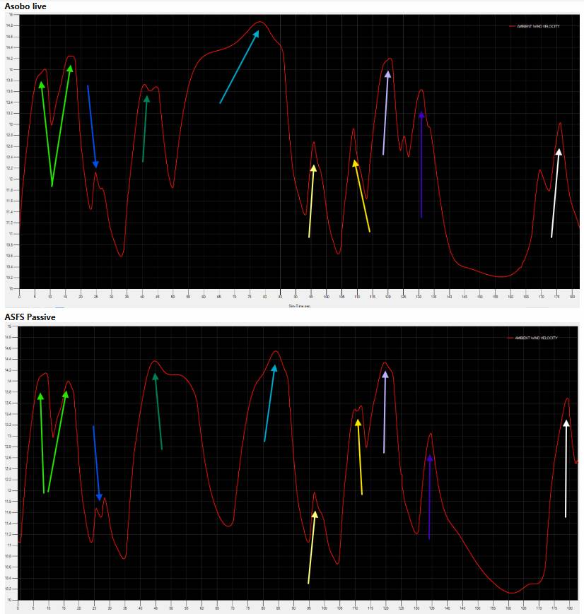 At different airports, with different winds, there was a detectable, repeating pattern that was always present, whether there were 1 knot winds, or 20. I highlight these near identical peaks, and troughs in one image with the green arrows.