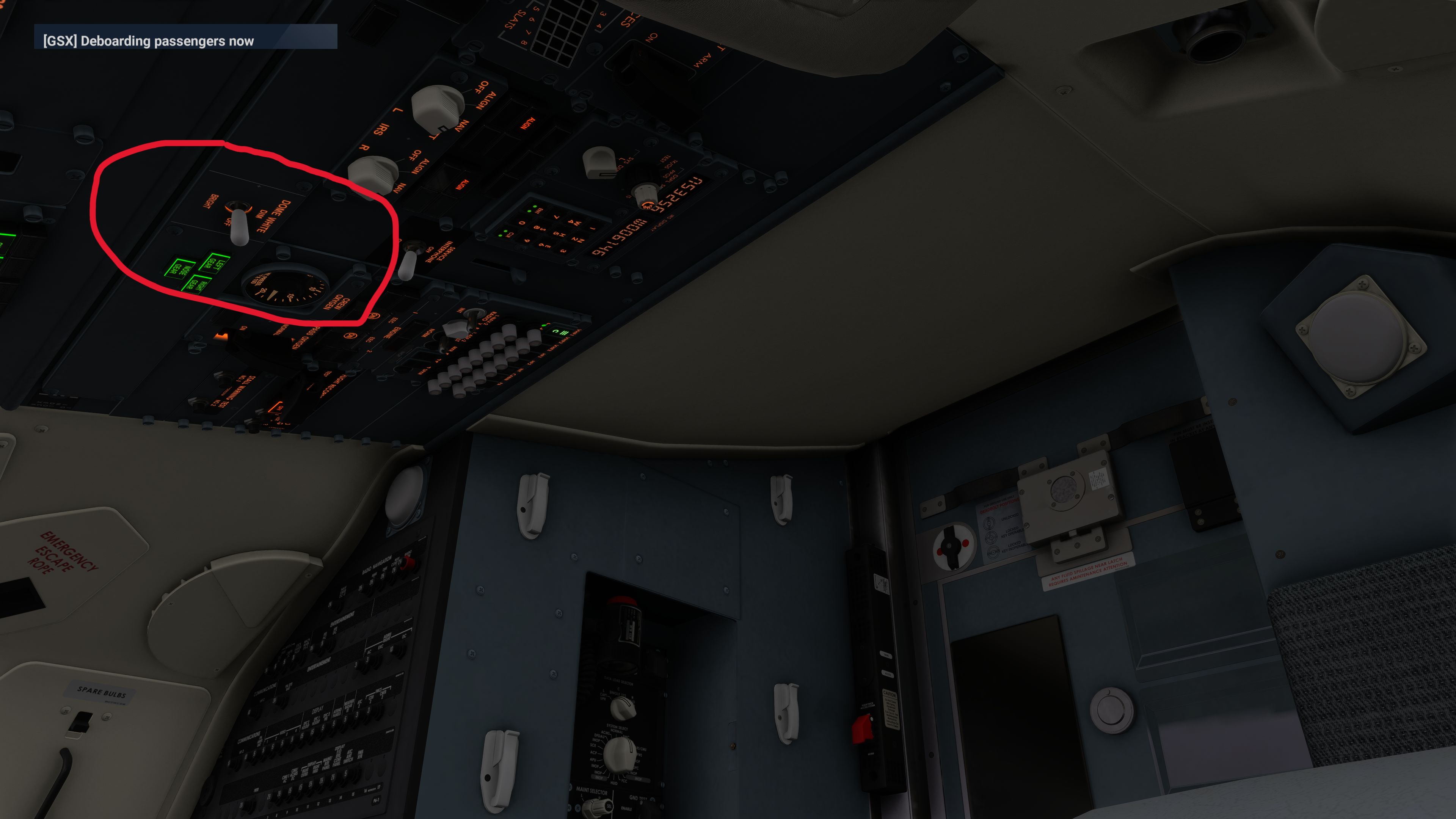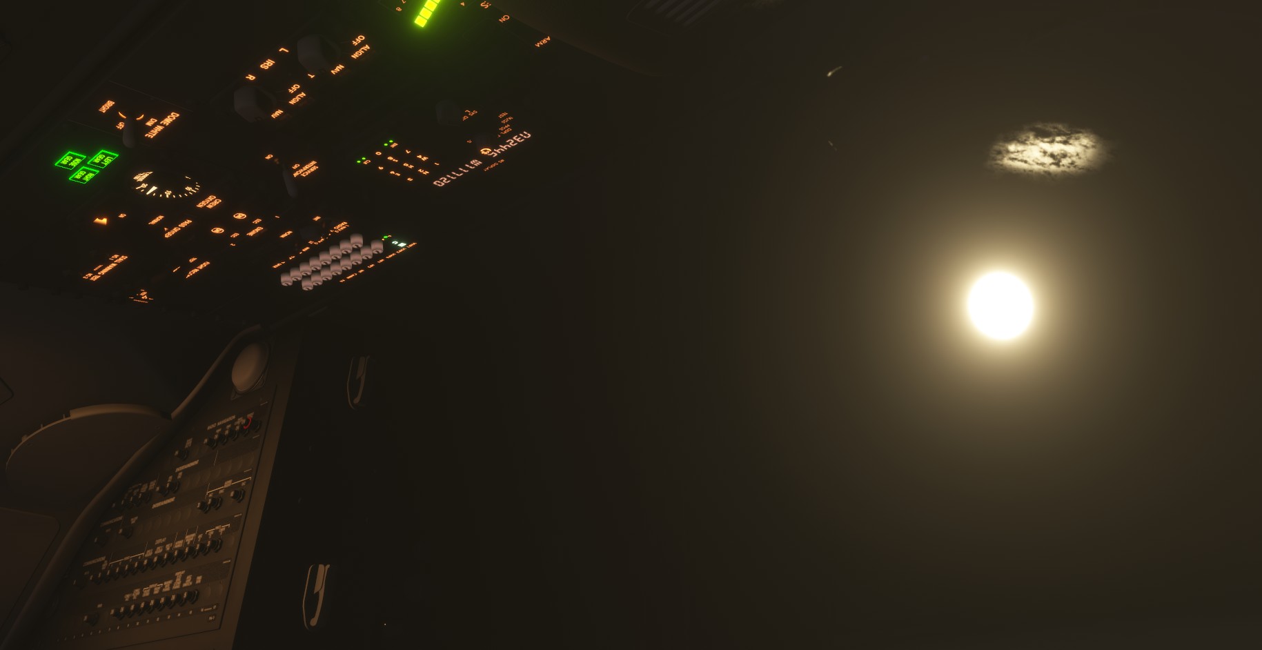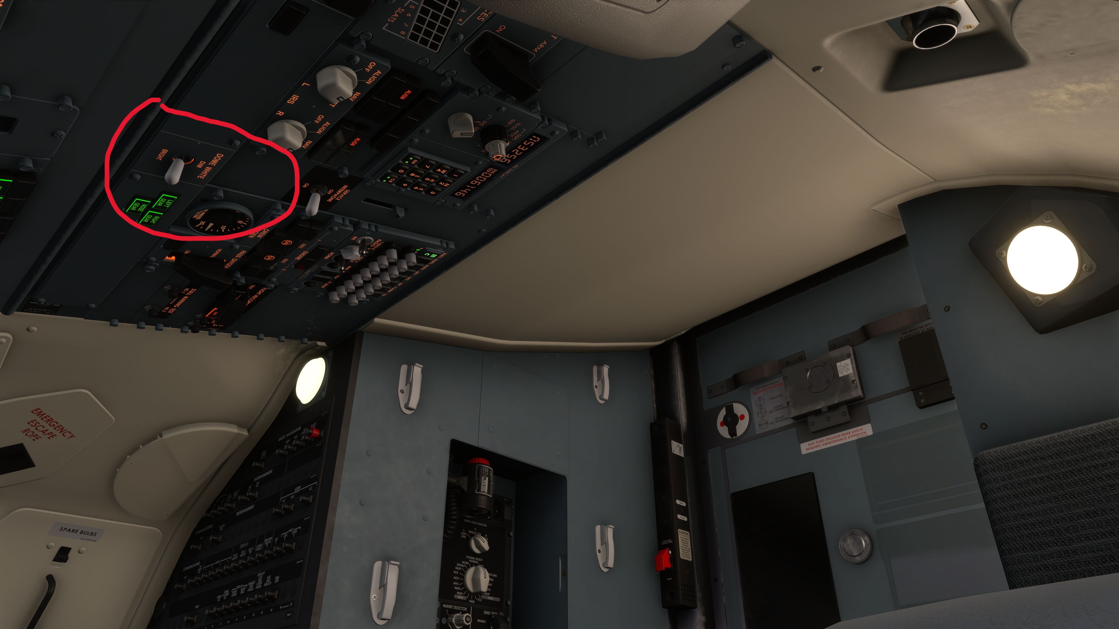 There are cockpit lights behind both the co-pilot and pilot. The co-pilot light is connected to its dial and can be turned off, but the light behind the pilot is not connected to the corresponding dial and stays brightly illuminated.