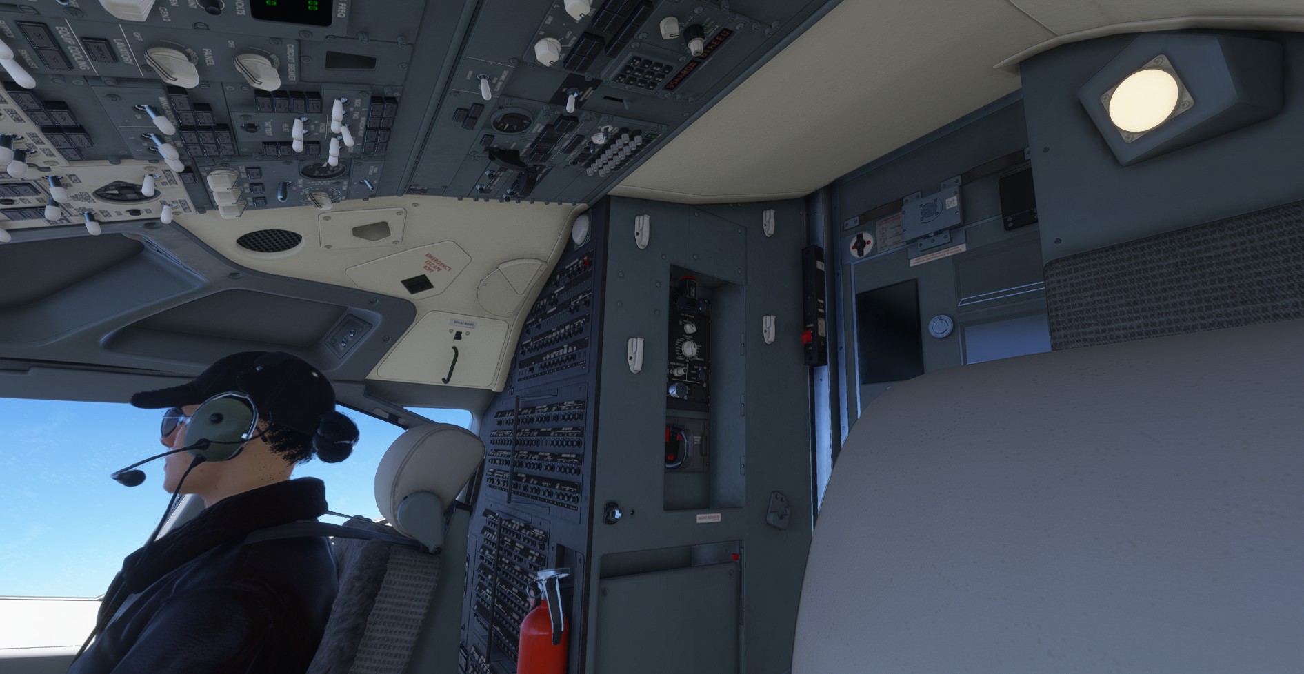 - Shift camera view to look behind the pilot toward the ceiling of the aircraft