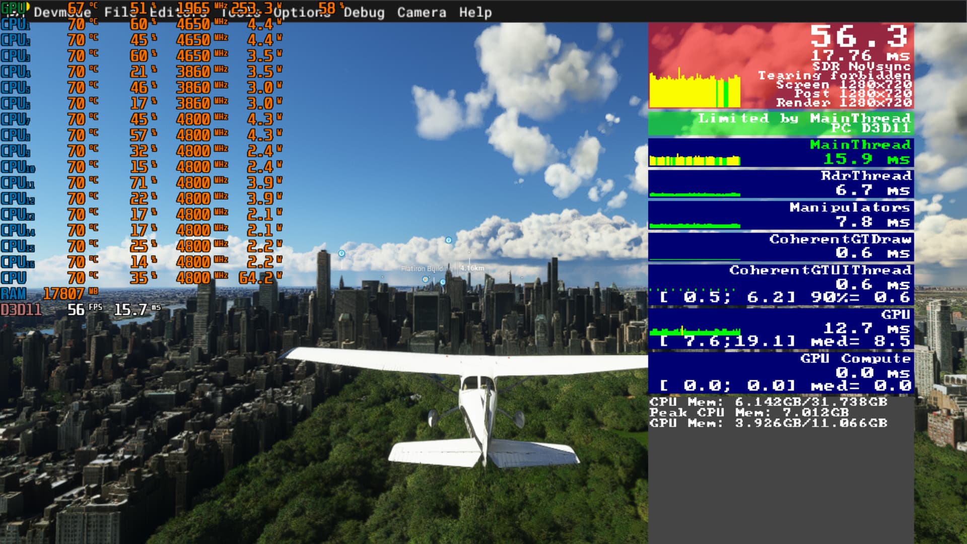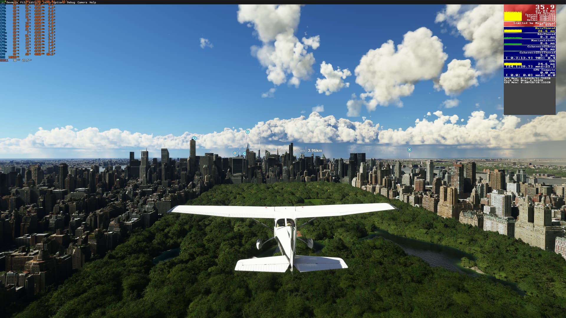 You mean over Central Park? I only get around 35 because i am in the gpu limit . When is set a lower resolution (1280x720) so my cpu limits the frames i get 55-60. I tried it again with the same settings and when i fly as low as he does over the trees i get around 50 fps He gets 70 fps. https://www.youtube-nocookie.com/embed/AWgc0_V9w0I