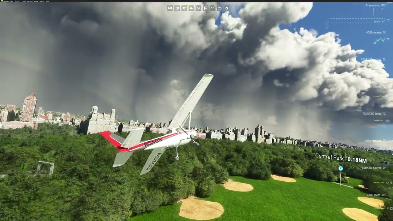 Here’s my 5800x3d test results flying just over the trees as in the earlier video. I’m running a 6600XT graphics card, so I won’t be able to match the streamer’s Ultra default settings exactly for a like for like comparison. I first took a baseline flight with my current settings before any changes. I then lowered my render scale so that my GPU frame time is 10ms or less to ensure I’m not GPU bound in any of these tests. I’m using the partly cloudy default and no multiplayer or other traffic (AI, FSLTL, etc).