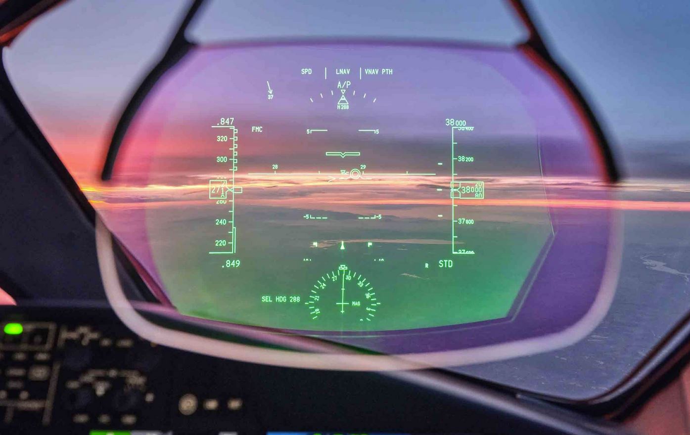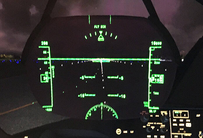 Use the HUD camera preset. The standard cockpit camera is situated too far back in the cockpit for the collimated HUD to show correctly.