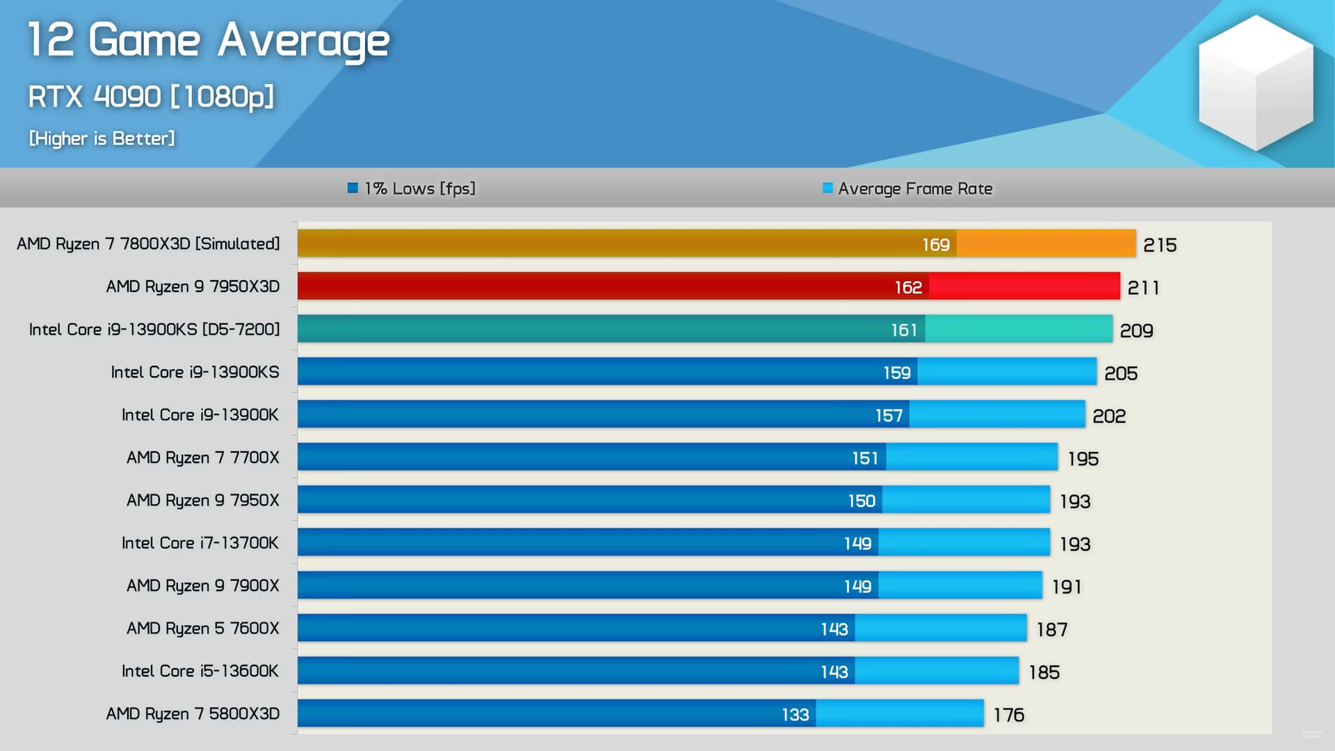 Here the average of 12 games tested. The Simulated 7800x3d is just the 7950x with one of the CCDs disabled (the one without 3D cache).