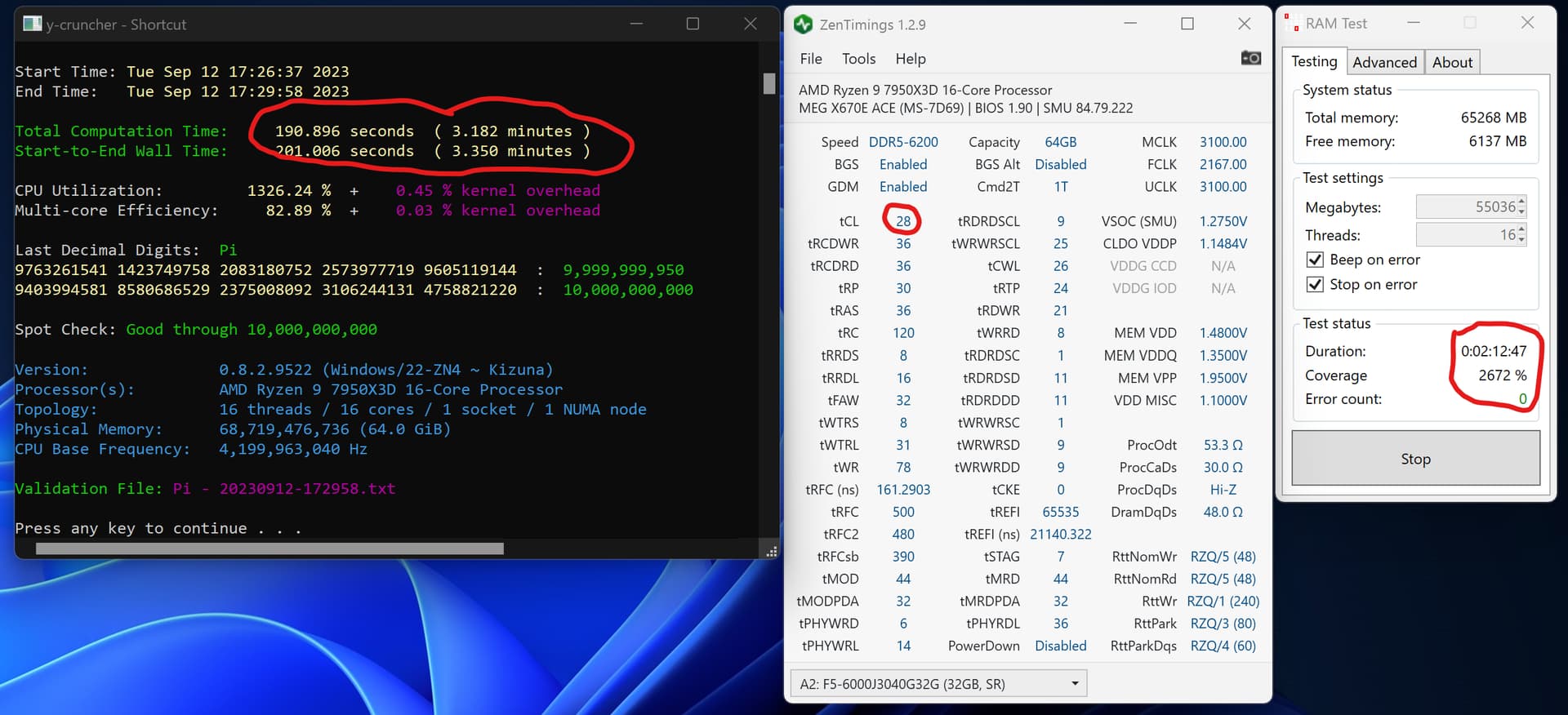 Iâm a newbie with my 7950x3d so I have a lot to learn about this thing. I did 30 minutes each of the OCCT test as you suggested above. Passed, thankfully. Iâm still working on the memory timings and looking to see how much further I can push the cores. I found that one core (#12) caused a crash early on in my testing so now I have all of the cores set at -15 CO value and core 12 at zero CO value. I want to try more granular testing to tighten the screws even further on this thing. I think I got a good one though. Weâll see.