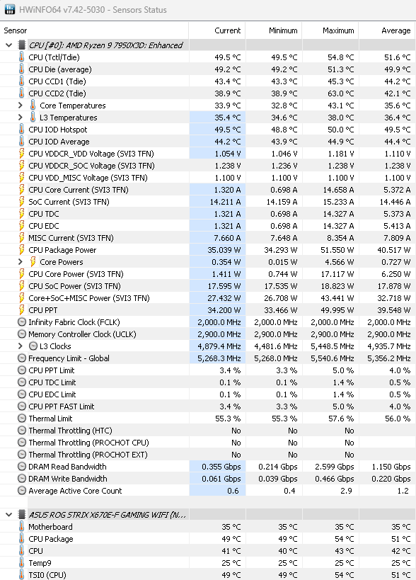 My 7950x3D idles at 51-52°C with an AIO liquid temp of 31°C and a case interior temperature at 27°C. The pump runs at performance setting.