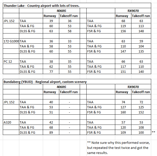 Thanks for posting that chart - I found it very informative. As a bush flyer that rarely flies between big-city airports, your stats for Bundaberg was appropriate for my type of flying. I also find TAA + FG provides good visual quality. I suspect flights are loading faster as the new GPU is less of a bottleneck than the old one.