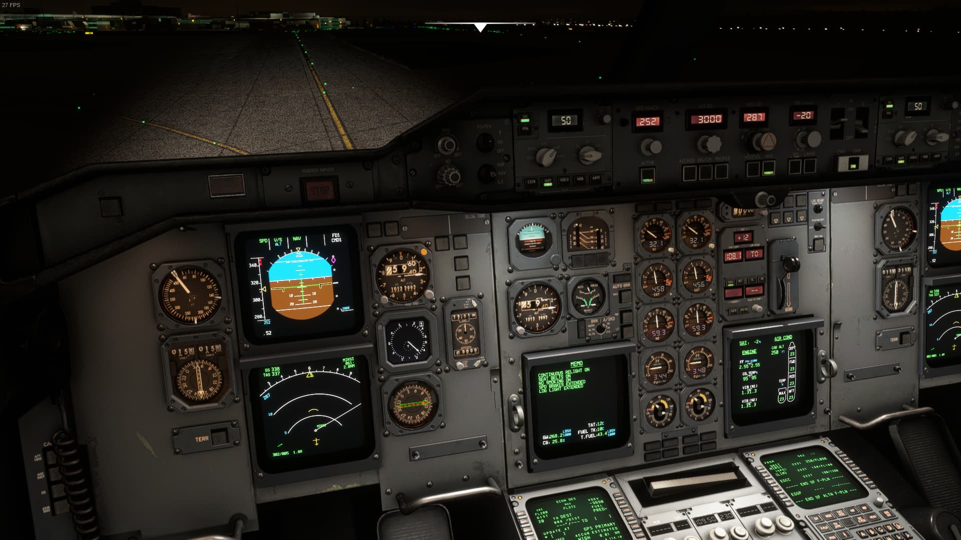 All flight deck instruments freeze. Dials can turn but the corresponding numbers don’t respond. CRTs freeze. Primary altitude gauges partially freeze. The needle and least significant number wheel continues to respond to changing conditions, but the most significant number wheels and barometric number wheels freeze. Standby attitude indicator remains responsive, as well as airspeed needle and VOR compass. VOR needles in the instrument remain frozen. In the overhead, fuel pump buttons and window/probe heat buttons behave normally. The flight deck door is unresponsive. Gear lever animates but gear is unresponsive. Engine fuel cutoff switches do not respond to click interactions, but accepted commands from hardware peripherals. Autopilot CMD switch did not respond, but appears to have disconnected because the aircraft nosed-down in the climb. Auto-thrust disconnected. N1 dials and other engine parameters needles and displays froze. FCU and Thrust rating buttons animate and produce sound, but no lights or displays on the panels respond. Engines, flaps, and speed brakes responded to hardware peripherals, but did not animate externally.