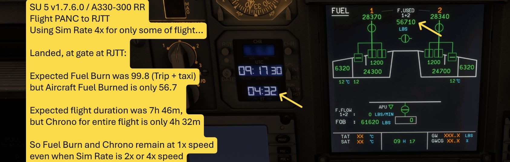 Observe how the fuel burned is much less than expected. Also compare at landing. The longer you use Sim Rate, the larger the discrepancy grows.