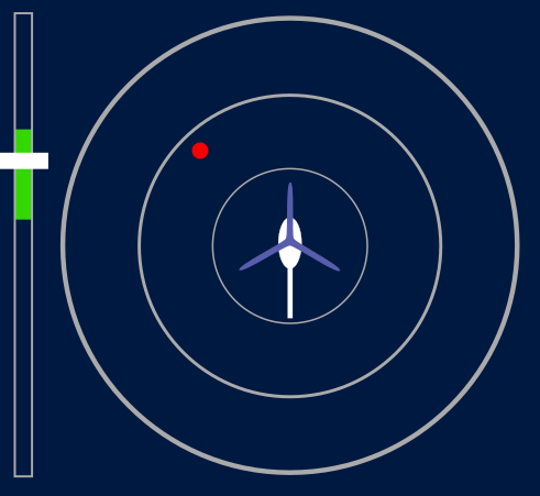 Graphical system showing a circle of 15 meter radius around the helicopter. A concentric circle every 5 meters inside for orientation. Orientation is Heading Up always. The Helicopter is represented as a symbol to scale and always centered.