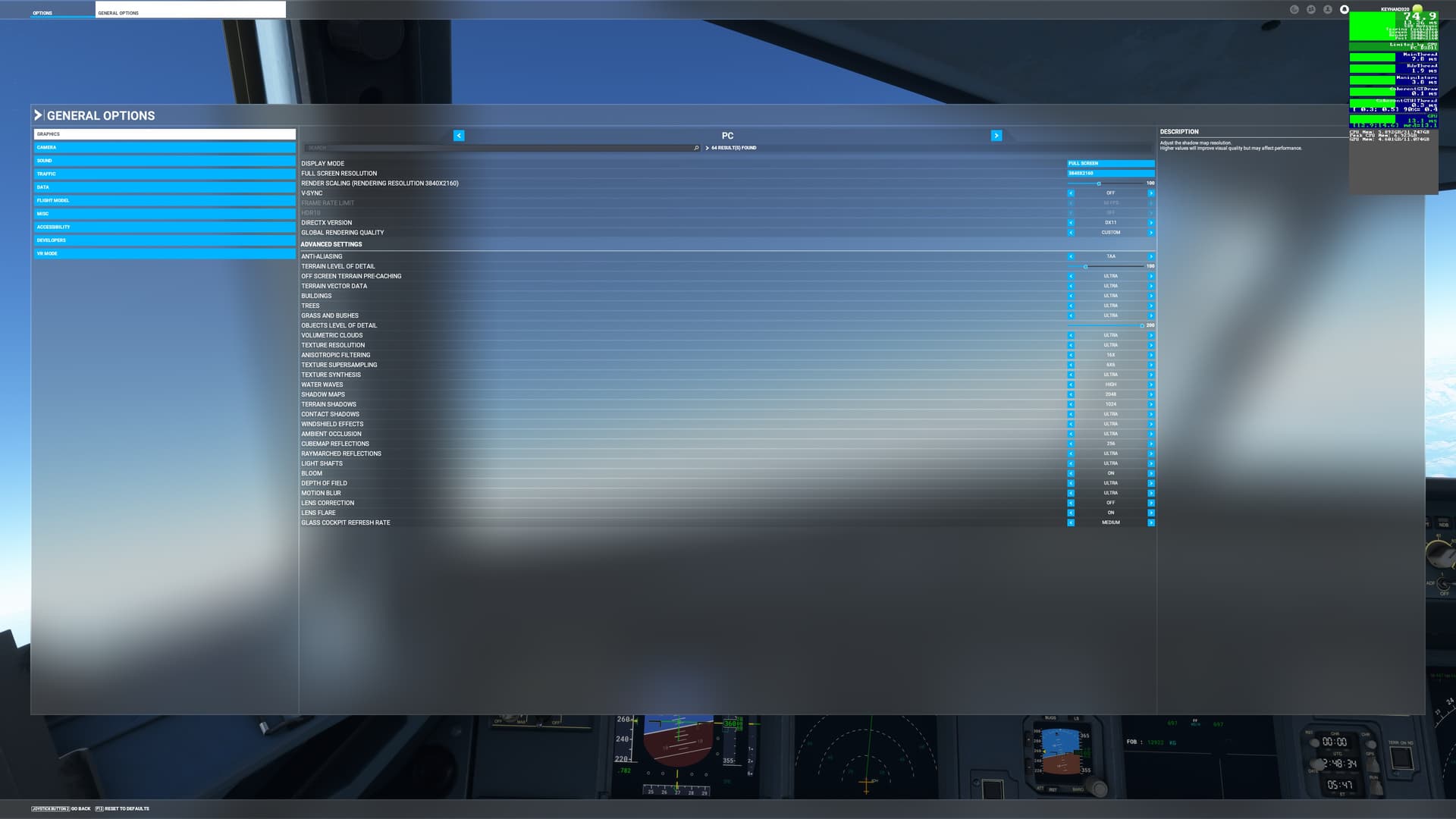 I believe I found the setting that causes the performance degradation over time. As many of you know, my flight path for this test is KDFW-PANC. I flew this route more that 20 times. Regardless of my configuration, I always had problem for the last 45 min and my FPS was dropping to 25 when I was was closing to JOH. During last few days I was testing different graphic settings and found out the reason of decreasing GPU load and then performance degradation is the Terrain Level of Detail āAt least for meā. Looks like anything over 100 will cause performance issue after a couple of hours flying. My default settings was Ultra, I changed it to High End PC and flew the same route. I had +80 FPS for whole flight, even over JOH my FPS was 83 or so. Then I changed the Terrain Level Detail to 200 and didnāt touch anything else, then flew the route again, over JOH the FPS was around 30!!! I paused the sim, changed the Train Level Detail to 10, applied and resumed the flight. The FPS jumped back to +80, the GPU load increased to 98 from 35. After 30 sec, I paused the sim again and set the Terrain Level Detail to 200 again, applied and resumed the flight. The FPS was +70 and I finished the flight with no problem at all. No stuttering, no performance issue. So, you can try the same trick and let me know if that works for you or not. I attached two pictures that shows the FPS and system load before and after the trick. I hope this works for all of you.
