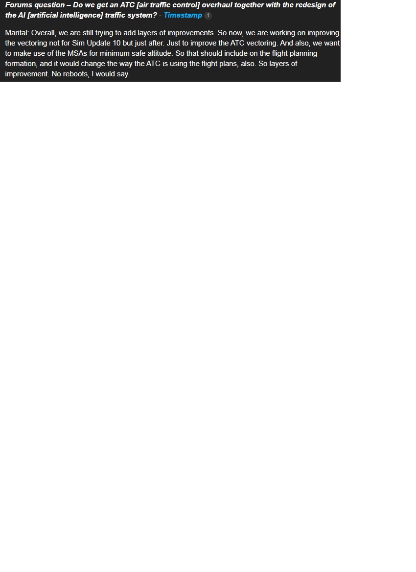 - PLEAAAAAAAASE, do something with the AI traffic with, at least, 2 or 3 more generic models adapted to real live traffic, STOP this annoying planes making 360 turns on themselves at the holding point, accelerate runway vacation, add flares, initial climb, speed reduction after go around, synchronise with ATC, etc., in short, do what everyone say for two years…