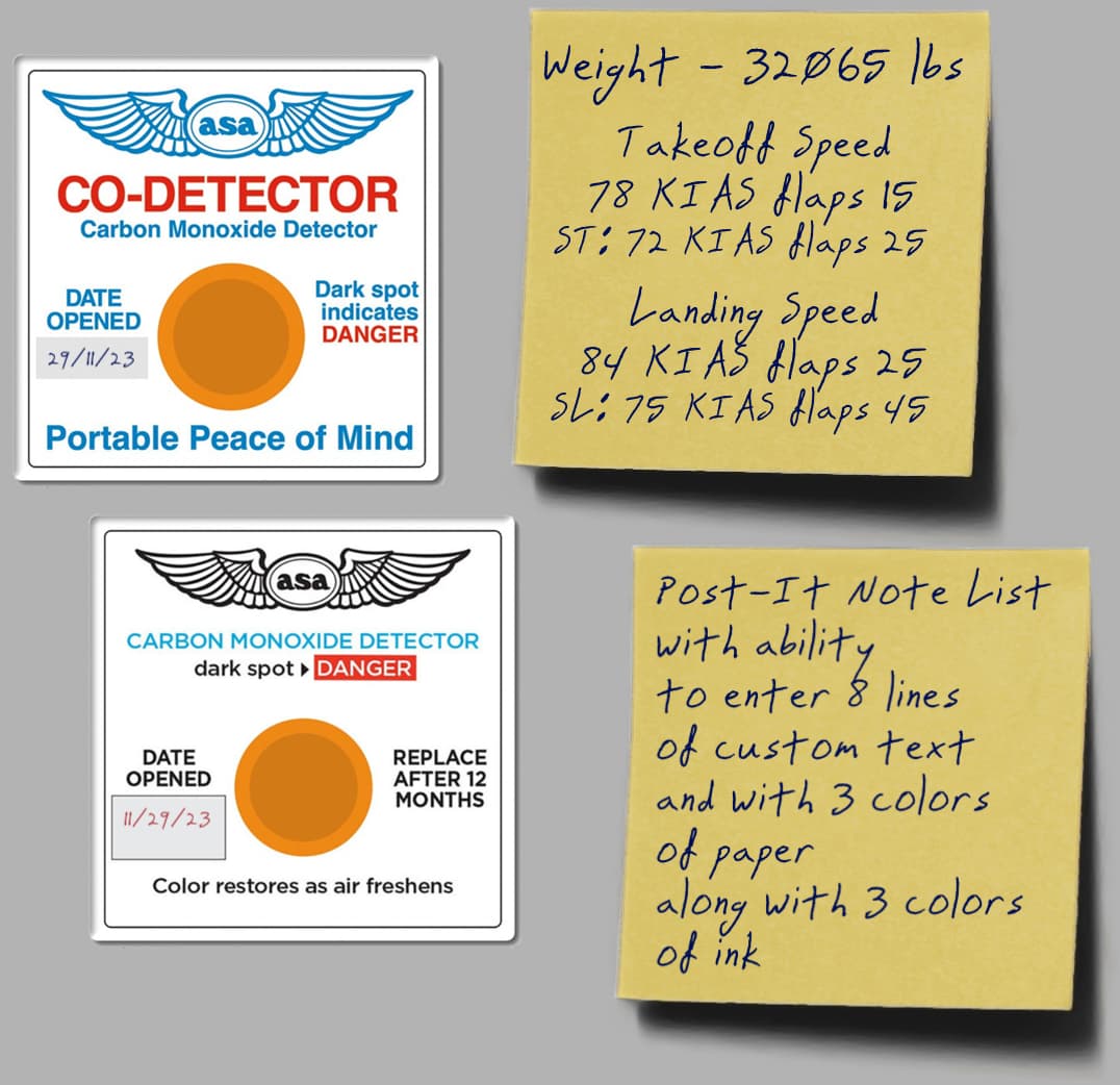 Common CO detector card found in many GA planes. Configuration options include 2 styles, 3 colors of ink, the ability to automatically use today’s date in D/M/YY format or M/D/YY format. Also allows for a custom manual text entry for the date. (2 different options shown in photo)