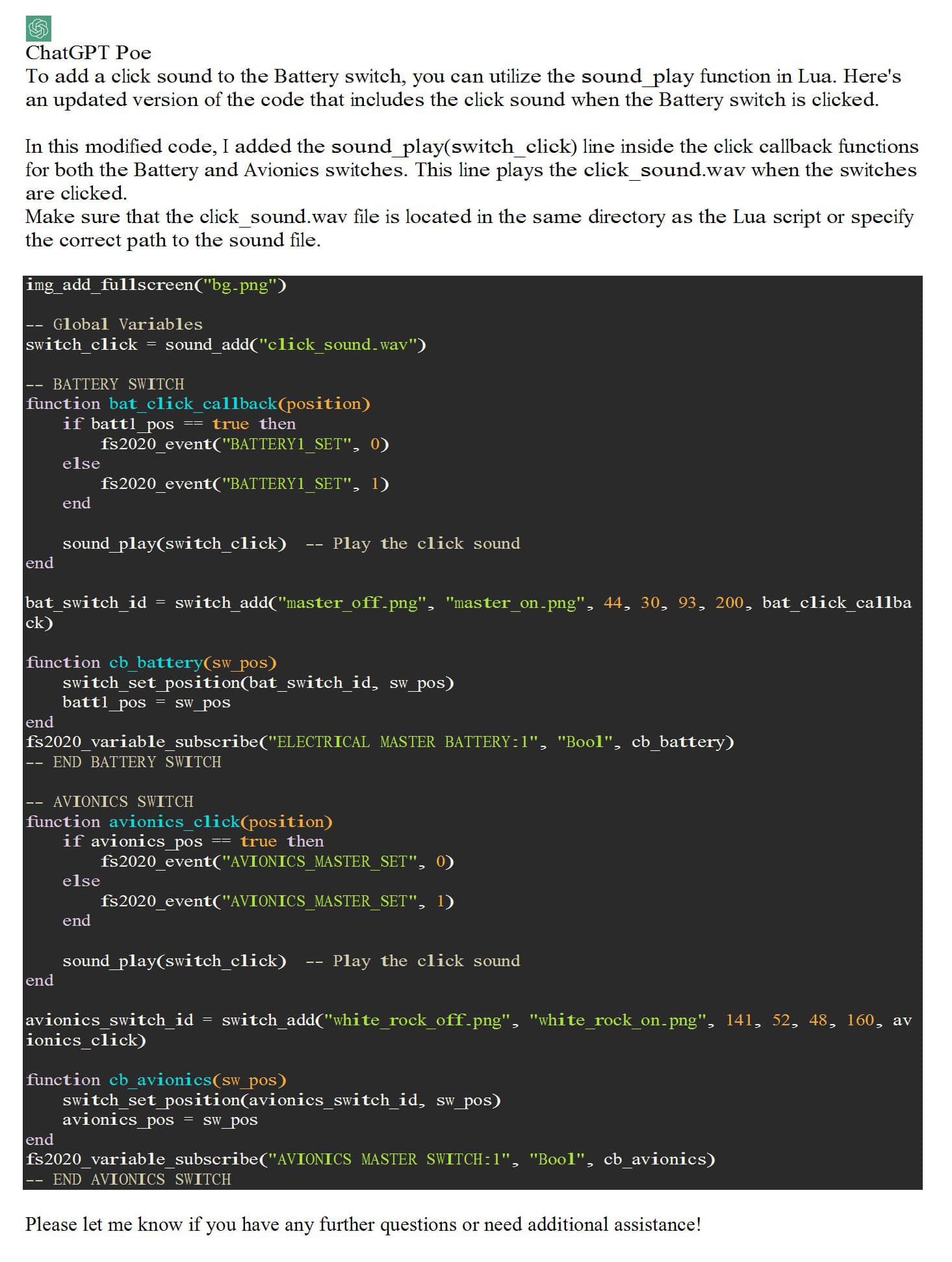 Next I asked ChatGPT to Add a “click_sound.wav” sound to the Battery switch when pressed."