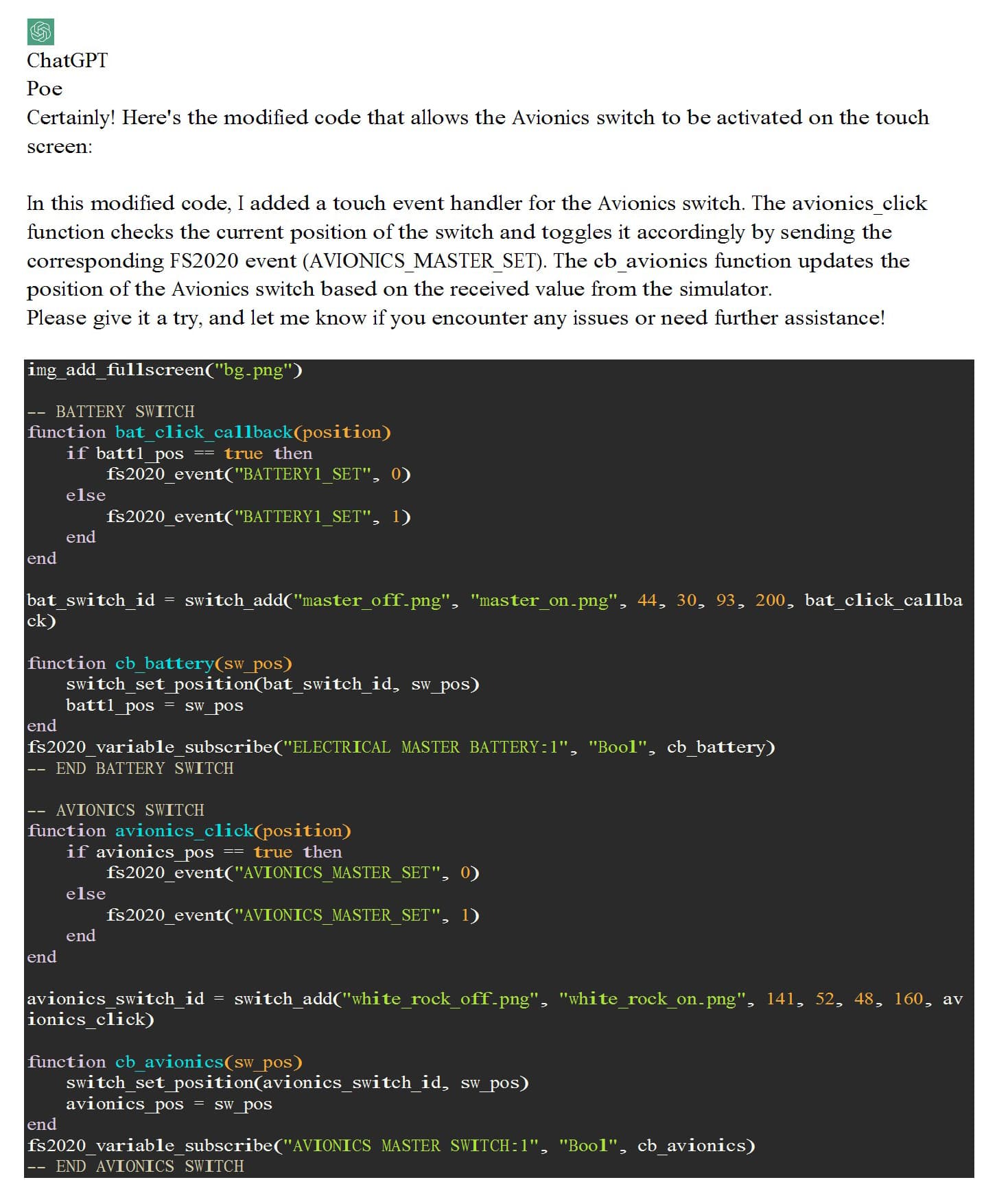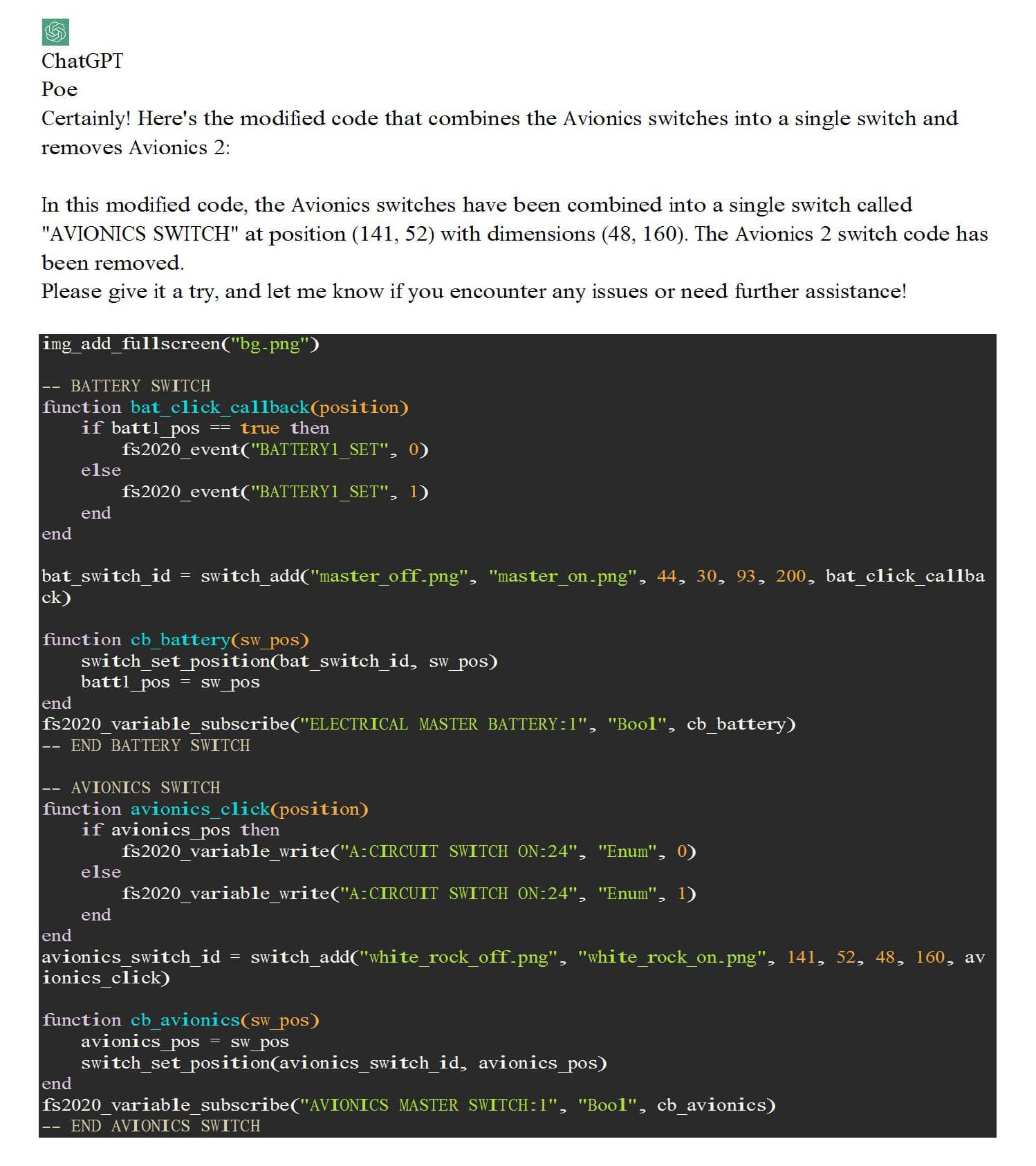 Yseterday I also asked ChatGPT to write the code for a stand-alone switch to operate the ENGINE MASTER. It wrote the entire code from start to finish - with generic names for images that I need to insert.