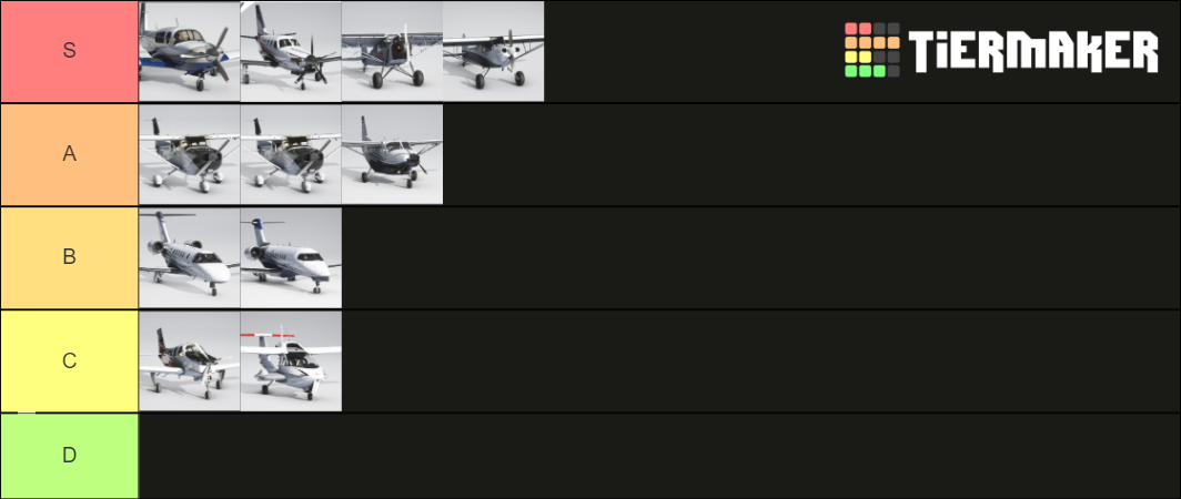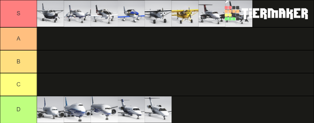 I made a tier list on a website called tiermaker, if anyone is interested. It has images of all the aircraft included in the Premium Deluxe version of the game, the Mooney, and images taken from the marketplace of the C182 and Kitfox. Here is a link to the template. I made this because I searched for one and I could not find an existing tier list for MSFS 2020 aircraft. I would love to see screenshots of your rankings of all the aircraft. Enjoy!