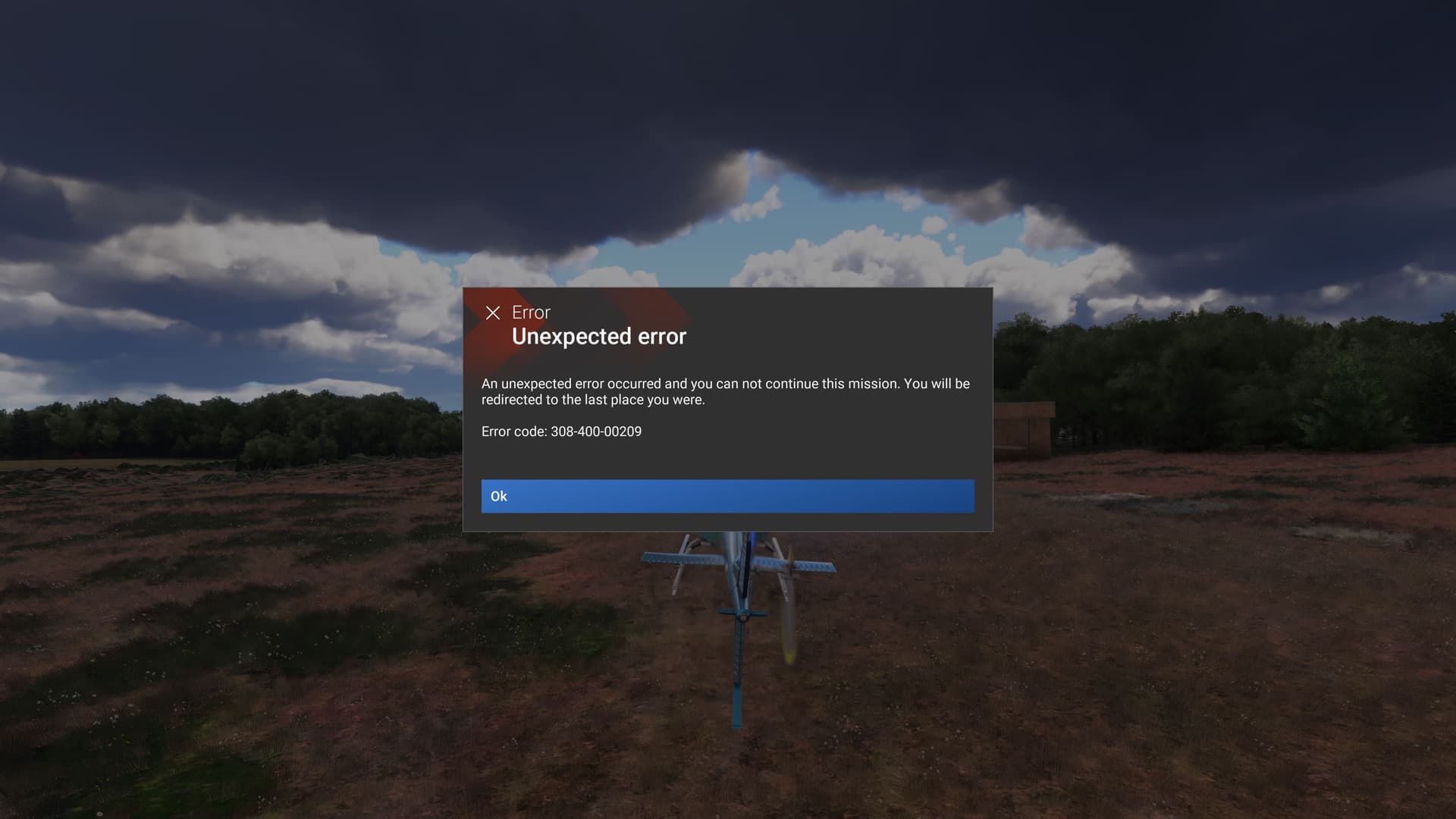 Within the first few minutes of every flightseeing mission I am experiencing the following “Unexpected error code: 308-400-00209.” Yesterday these worked fine.
