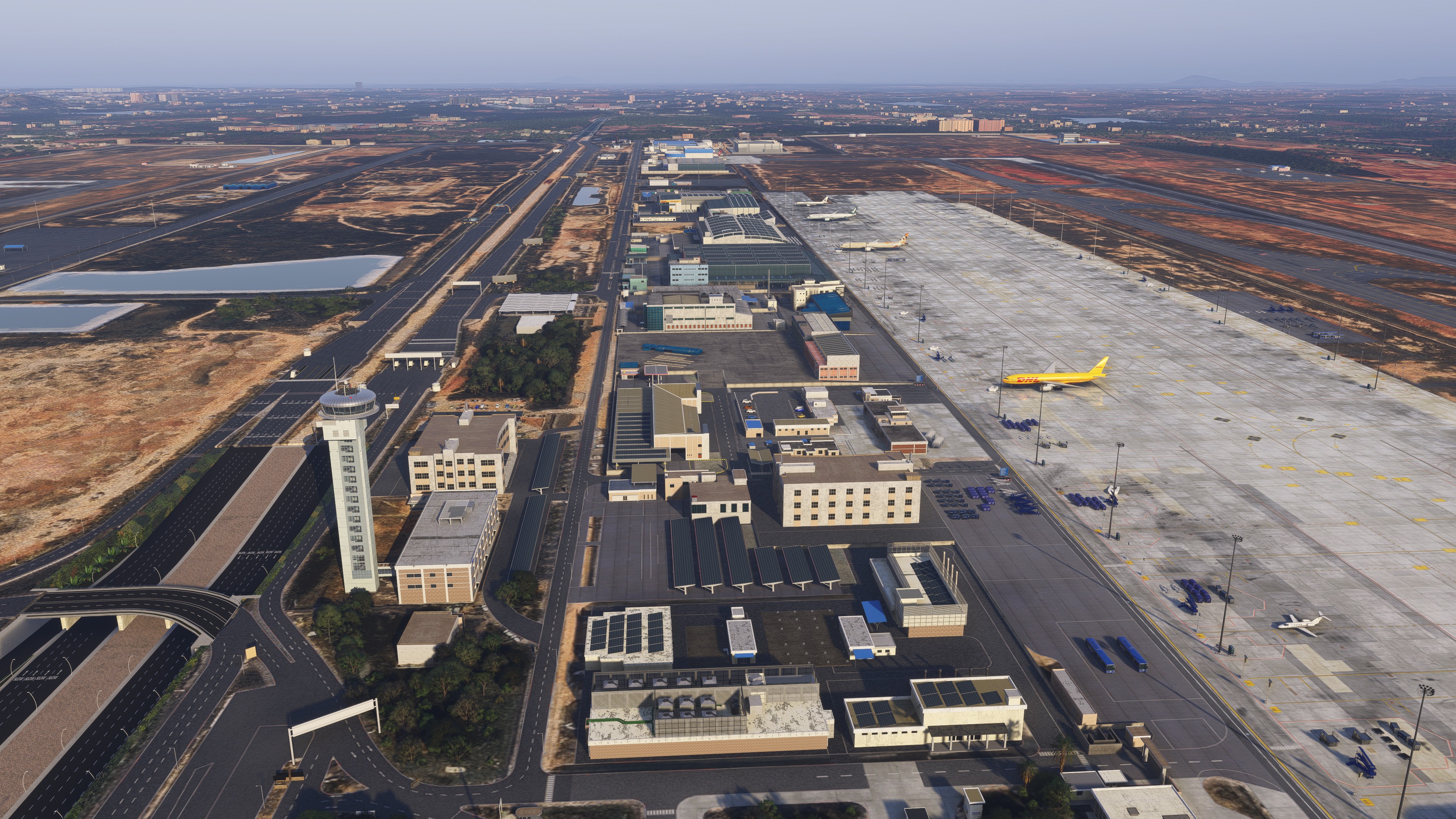 I got it. Overall, I like it very much. The buildings are beautifully modelled. I particularly like the dirty apron textures. However, the textures of the roads are one of the airport’s biggest weaknesses for me. They look very unrealistic. Unfortunately, Taimodels also uses these overly grainy road textures in their other sceneries. Another point of criticism are the completely flat taxiways and runways without any terraforming. Apart from that, however, it is a very nice airport that I can recommend. The terminal interiors are very detailed, even if they don’t quite match the quality of the absolute top developers. There is plenty of custom clutter and I also like the night lighting. The performance is also very good on my sytem, especially considering the huge size of the airport.