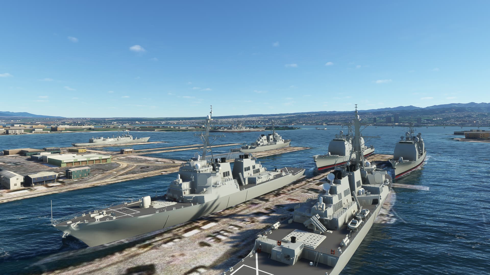 This scenery pack will introduce several new military and civilian models. The U.S. Navy vessels will include: