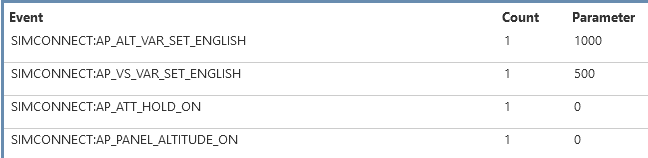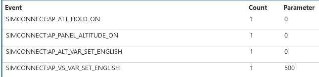 I don’t see any SimConnect output from twisting the rotaries…ah, I do when I turn on the AP, by pressing FD or ALT. It then registers those rotaries: