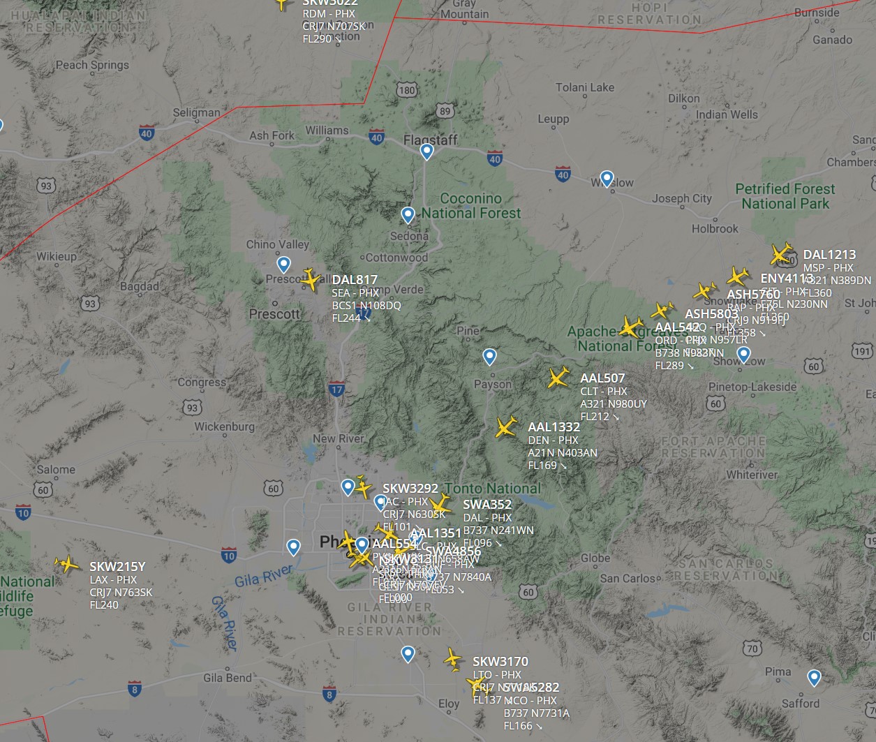 As shown below, Here is a view in FlightRadar24 showing an arrival “push” where you can clearly see the stream of traffic on one of PHXs busiest STARs, the EAGUL6 with arrivals from the north east. I can pretty much guarantee no deviations from this STAR until ATC vectors traffic on the downwind and turns to final.
