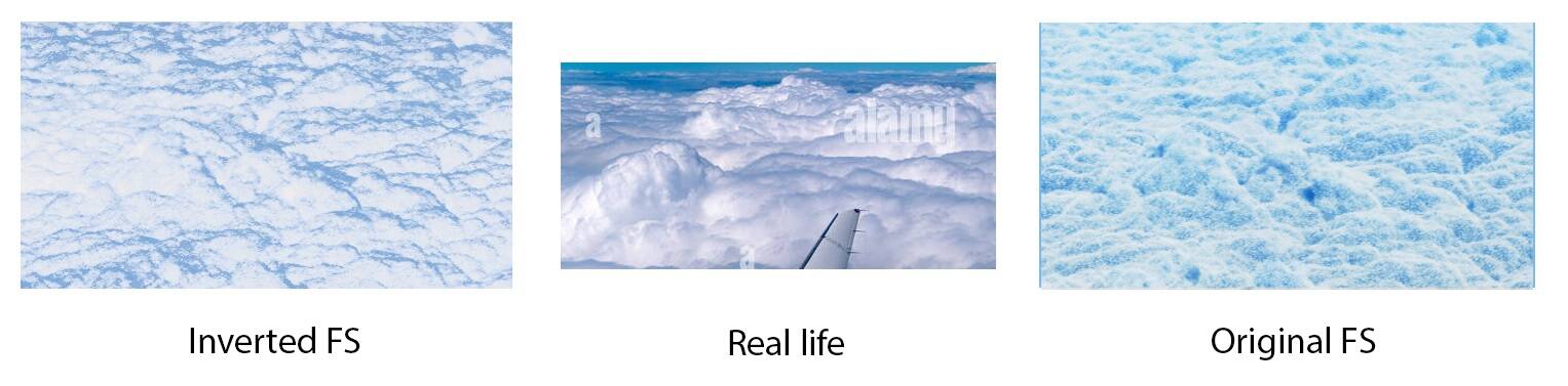 Shadow casting aside (because of course, in my inverted image, shadows are also inverted and so missing and that shouldnt be the case, I mean, shadows should be dark like in the original FS pic), the rest of the clouds look much closer to the real thing, with white normals and dark edges, which makes sense to me, as the max amount of reflected light should come from the normal surfaces to the camera while the edges (tangent to the camera angle and thus to the light, as remember we are talking about directly lighted clouds) look dark. If this inverted image could have proper dark casted shadows, it would look absolutely fantastic imho.