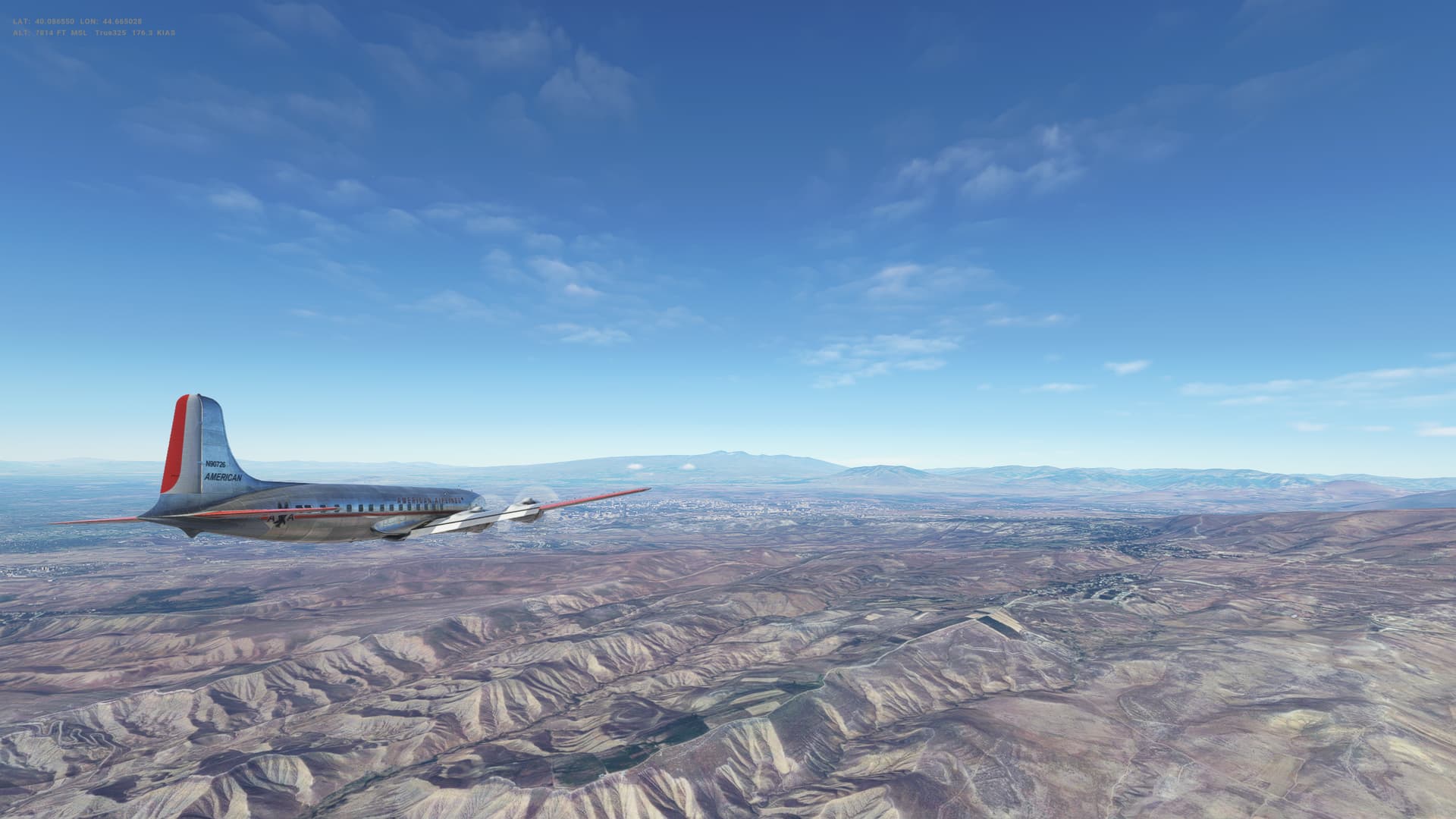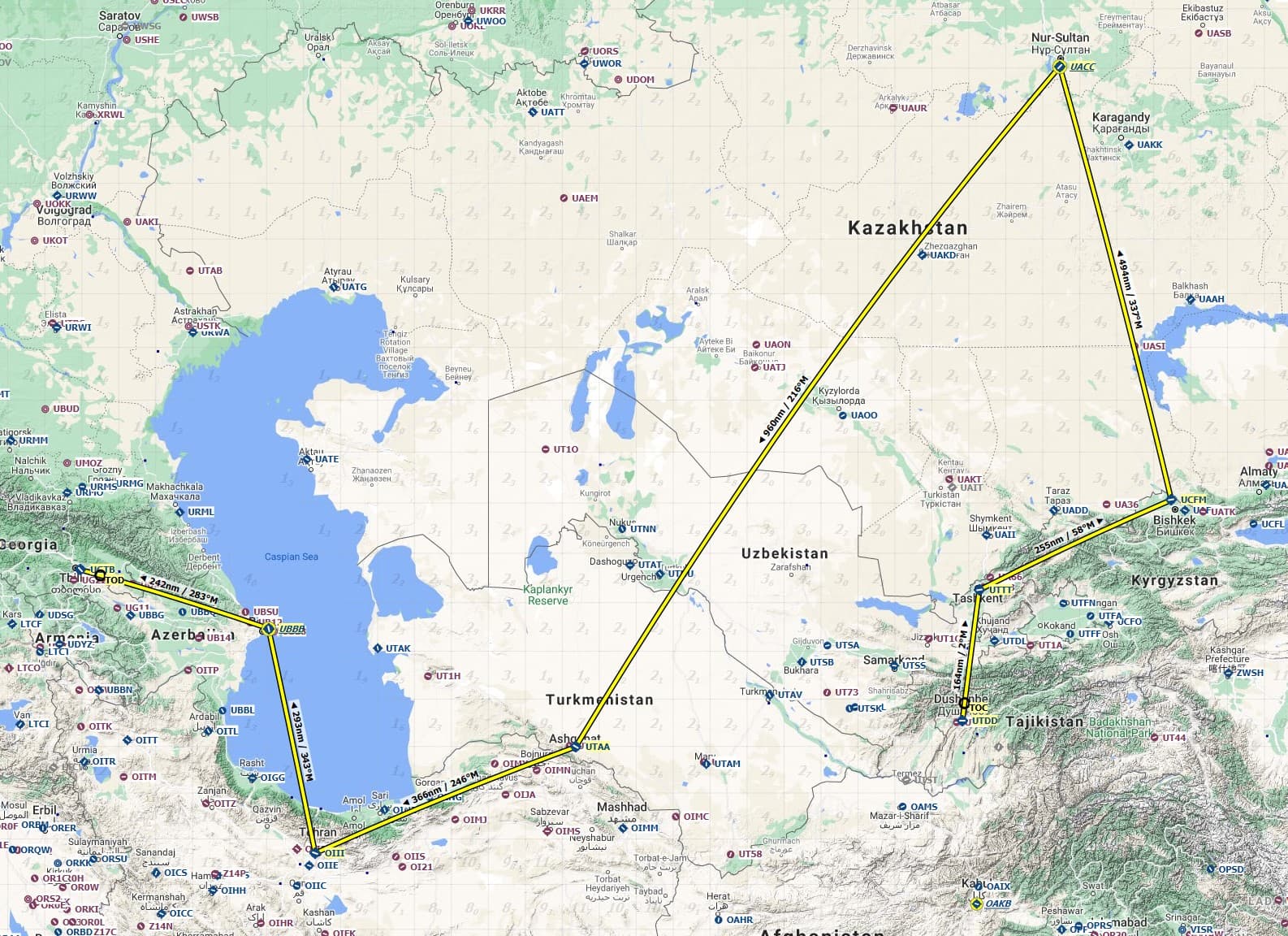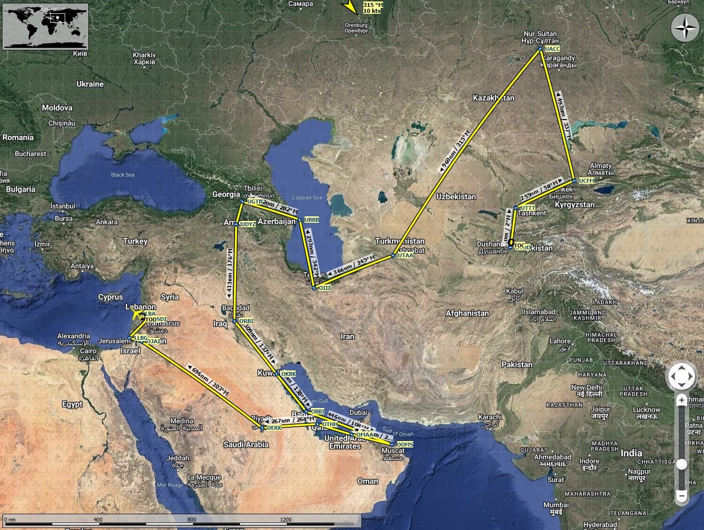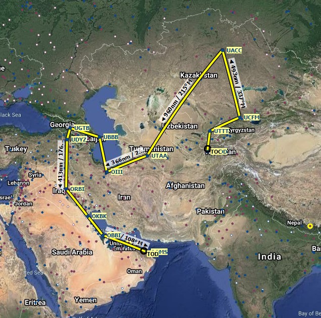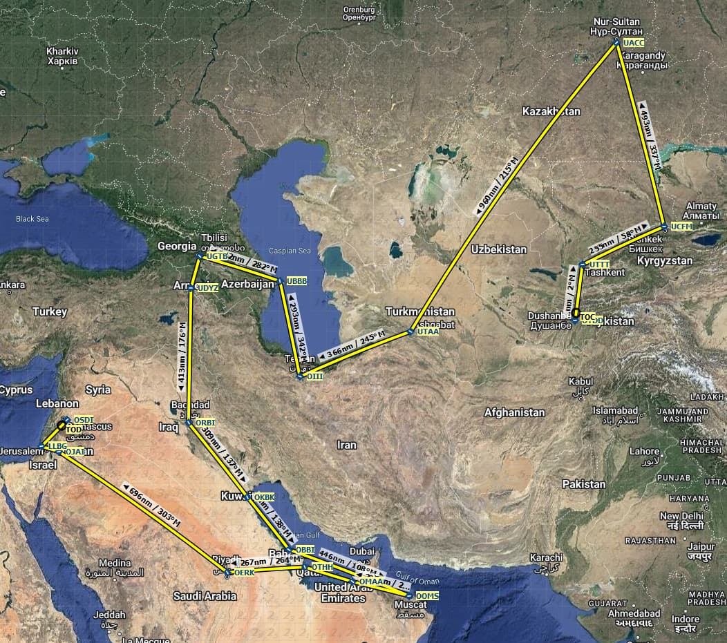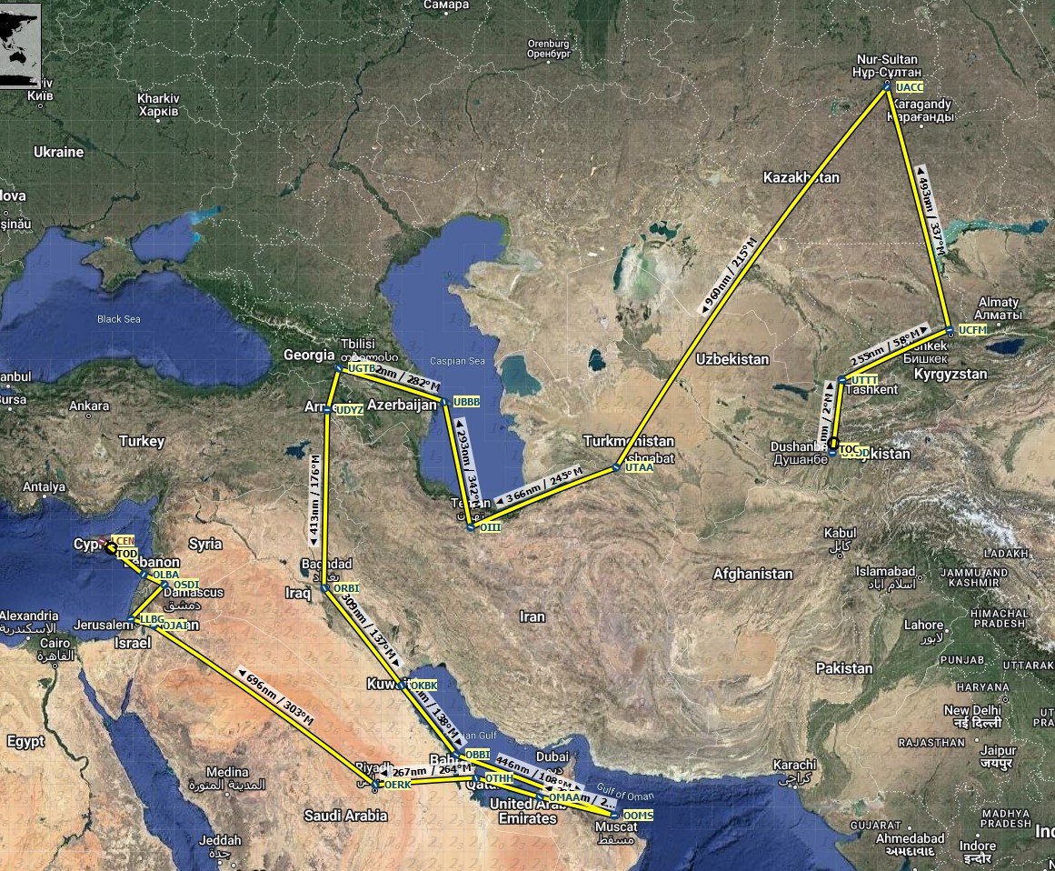 Leg 6 takes us back North, over the Caspian Sea to Baku. Much of this flight is over water, but the scenery at the start is spectacular as we cross the mountains at the Southern end of the Caspian. A shortish flight, just under 300 Nm as the crow flies. Once again the weather is beautiful.