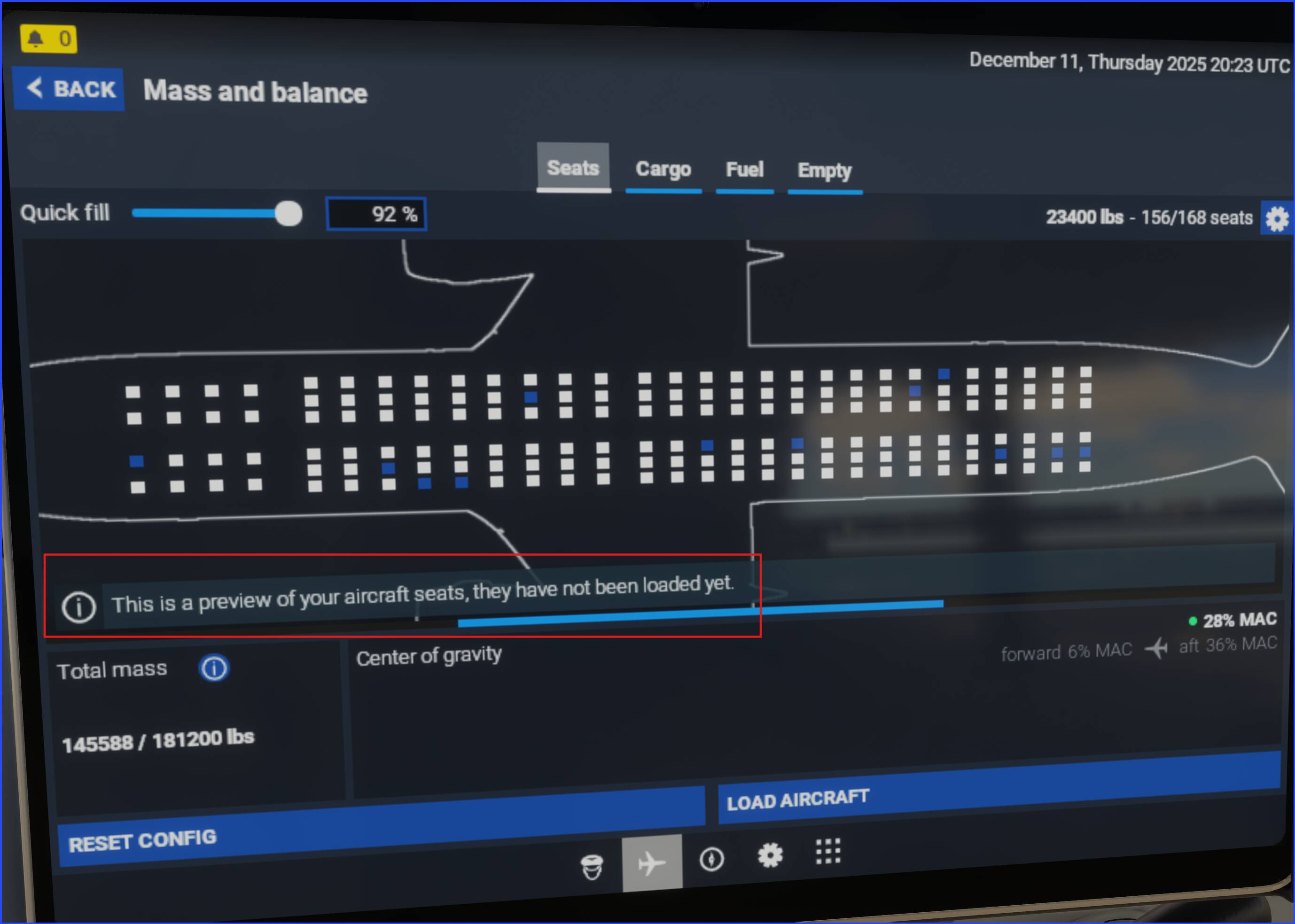 When loading the weights of passengers, cargo, and fuel into the aircraft with the EFB, the weight of passengers does not reflect in the CDU PERF INIT page until the passengers have been called to load via ATC Ground Services. This can be observed by using the LSK on the ZFW line of the PERF INIT page which should show the aircraft’s “sensed” zero fuel weight. This value is the same before/after using the “LOAD AIRCRAFT” button on the EFB Aircraft app, but will increase to the predicted ZFW value after Ground Services is called to board passengers.