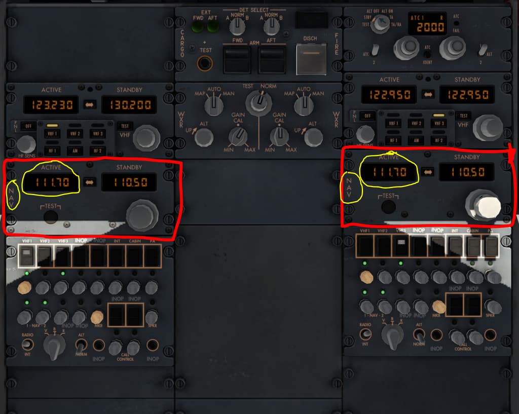 The red arrow in your image is pointing at a COM VHF stack, not a NAV one. The NAV frequencies are entered in the panel above that red arrow where it says NAV and ILS.