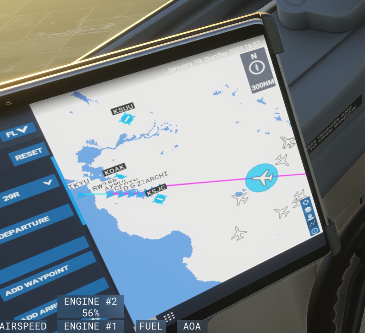 So far so good 1/2 way to SFO all the altitudes set in VNAV with defaults from the web based flight planner. Running at 60 FPS. See how long that lasts. Some stutters on takeoff runway.