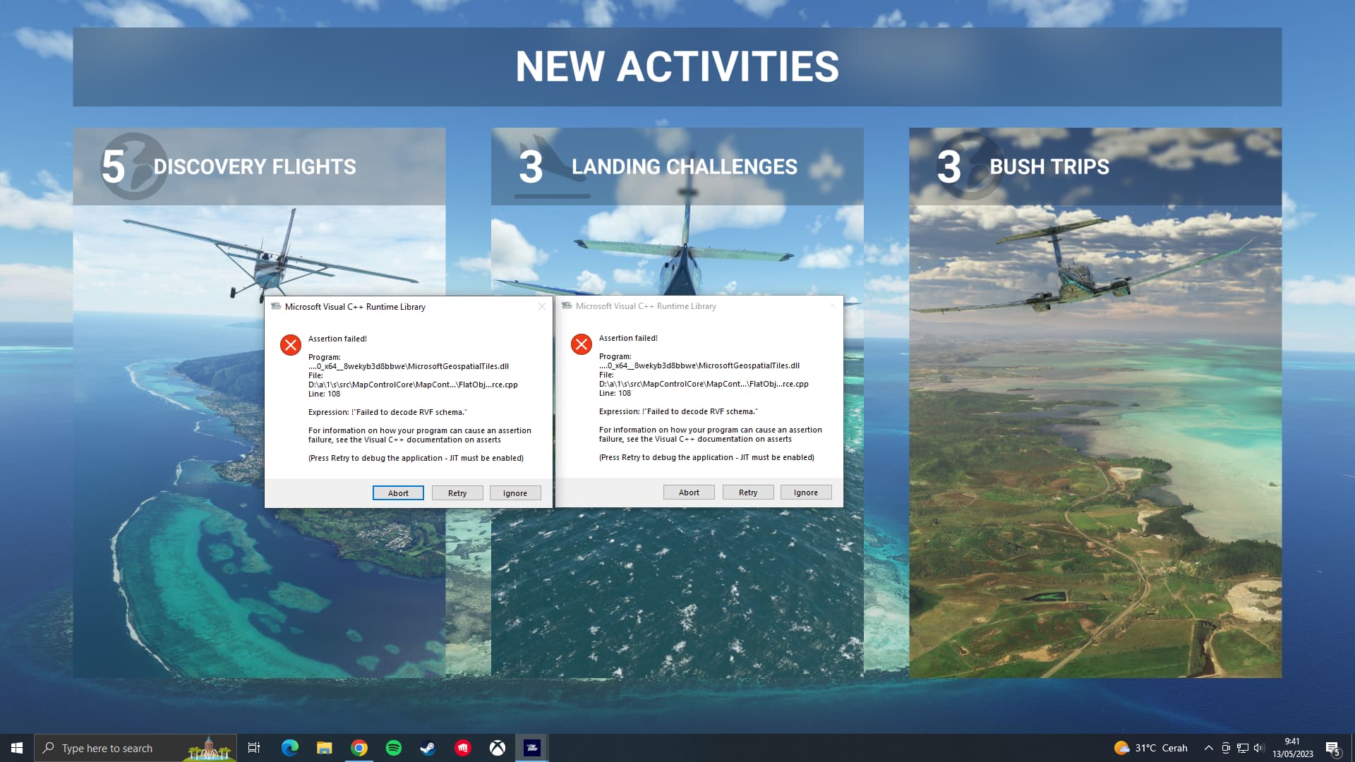 Hello,first of all i just want you guys to know i’ve been playing this game since release date one via Steam and one via MS Store with XBOX GamePass,till now i never play it peacefully,even after i fully bought a new PC,so today,“since yesterday btw”,my problem is : when i reinstall my OS because my WIndows is corrupted,caused by aburpt shutdown because FS2020 keeps freezing,forgot this i already wipea my ssd and get the new windows install,So,i redownload FS2020 to my C: Drive,where windows installed,while i download the game i got 3 BSOD,i forgot to take a photo of it,as time goes by,it finished the download with the final BSOD,i restart my PC and start FS2020 and guess what i get an error says Assertion Failed! i’ll attach the screenshot below,after the error popups,there’s 3 option IGNORE,RETRY AND ABORT,ignore give me BSOD only one in the first time launch i got into the main menu,rest i got BSOD,retry giive nothing,abort closes the game.