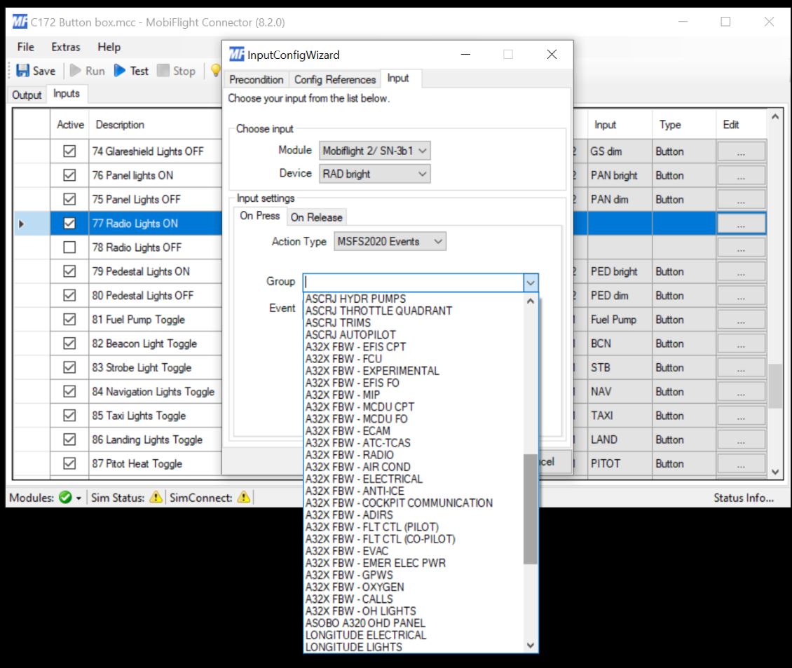 I know it’s been a few days, but I’ve been able to correct my issue for the most part. As of now, I am using the FBW A320 and setting up my box to work with all of the controls I would like it to do. Only issue I’m having now is getting Master Battery On to work. I can get Master Battery Off to work with turning off the batteries, but can’t get it to turn them on. I’ve tried writing Lua scripts that should turn them on but that is causing issues too.