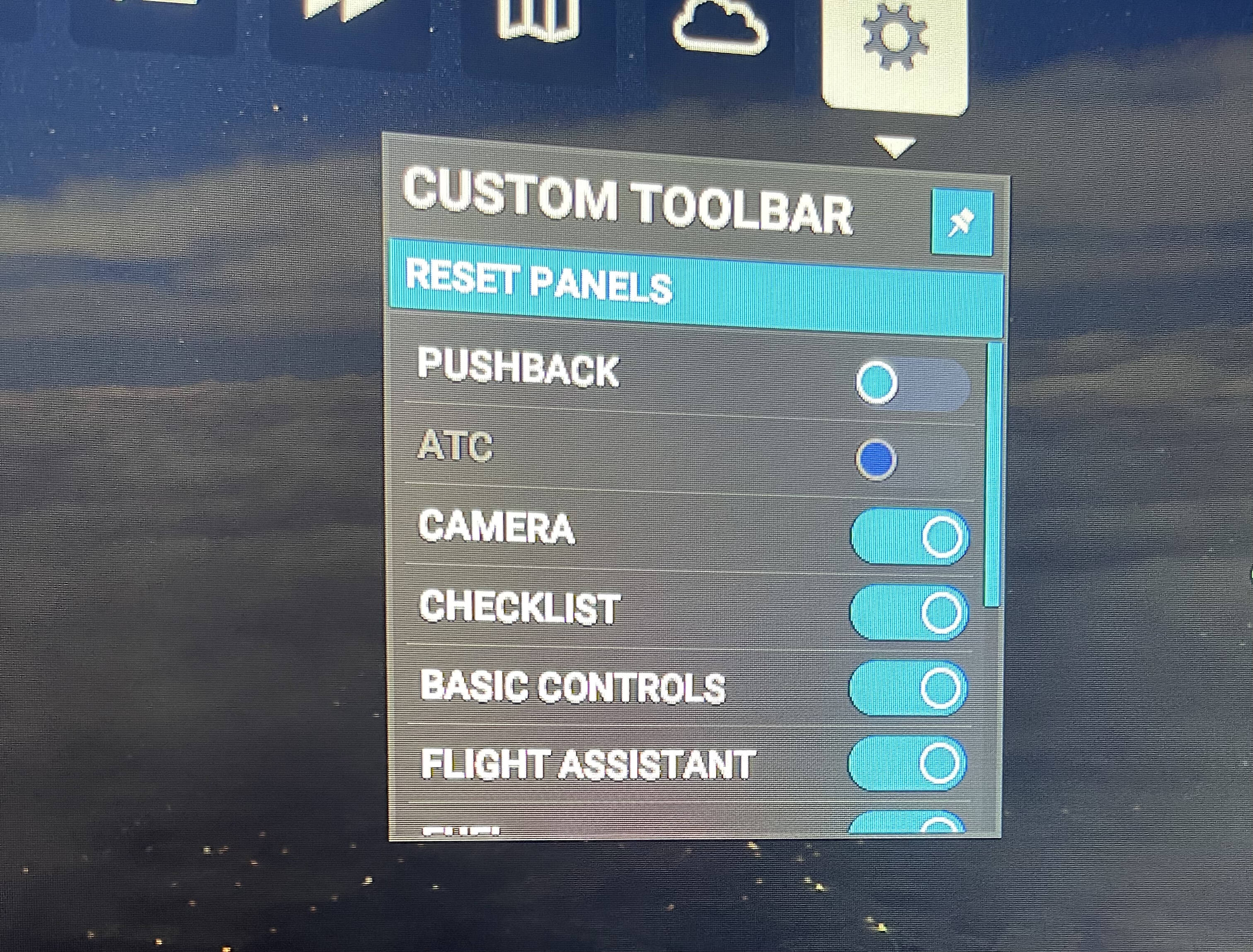 On the white tool bar where it shows checklist, AI control , weather etc. i dont even have the option to communicate with ATC it isnt there and when i try to click on the settings portion of the toolbar to add the ATC option is greyed out
