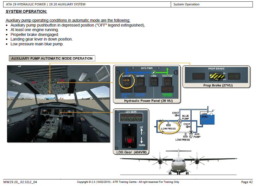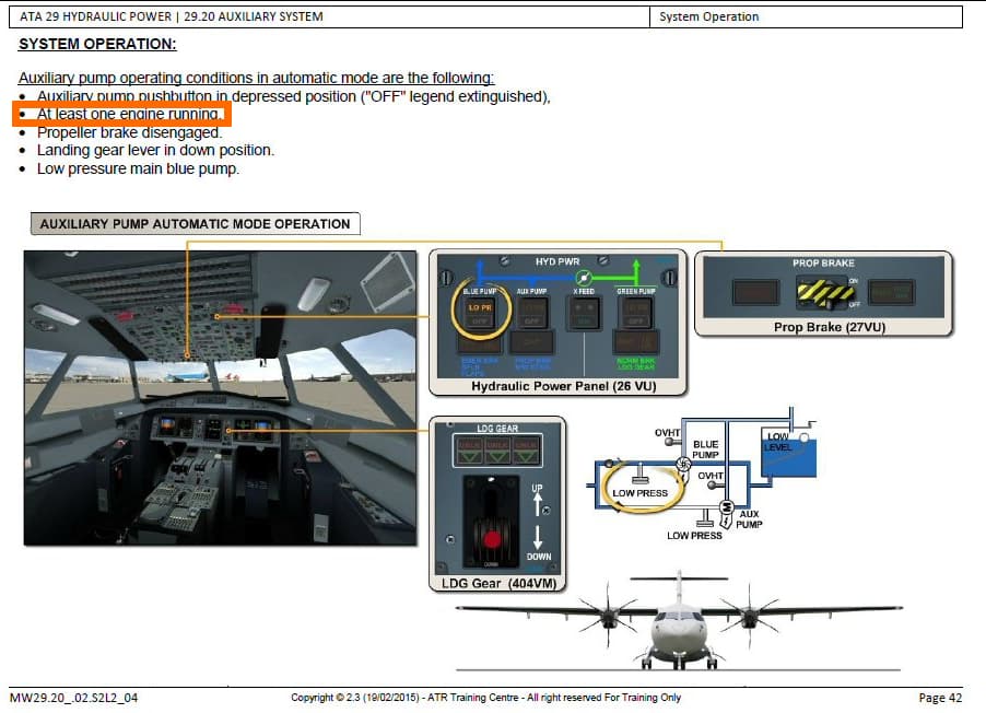 According to ATR FCTMto activate the prop brake during startup, if it is not already illuminated blue, the HUD AUX PUMB BT has to be pressed. Ready will then light up in green and prop brake can be activated.