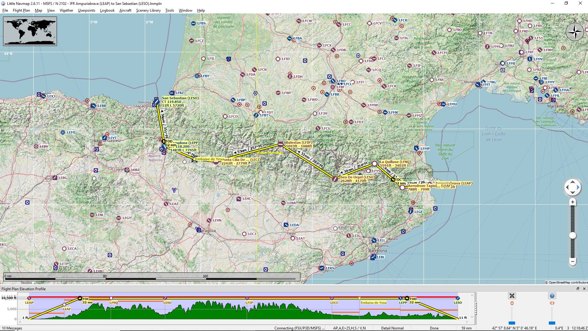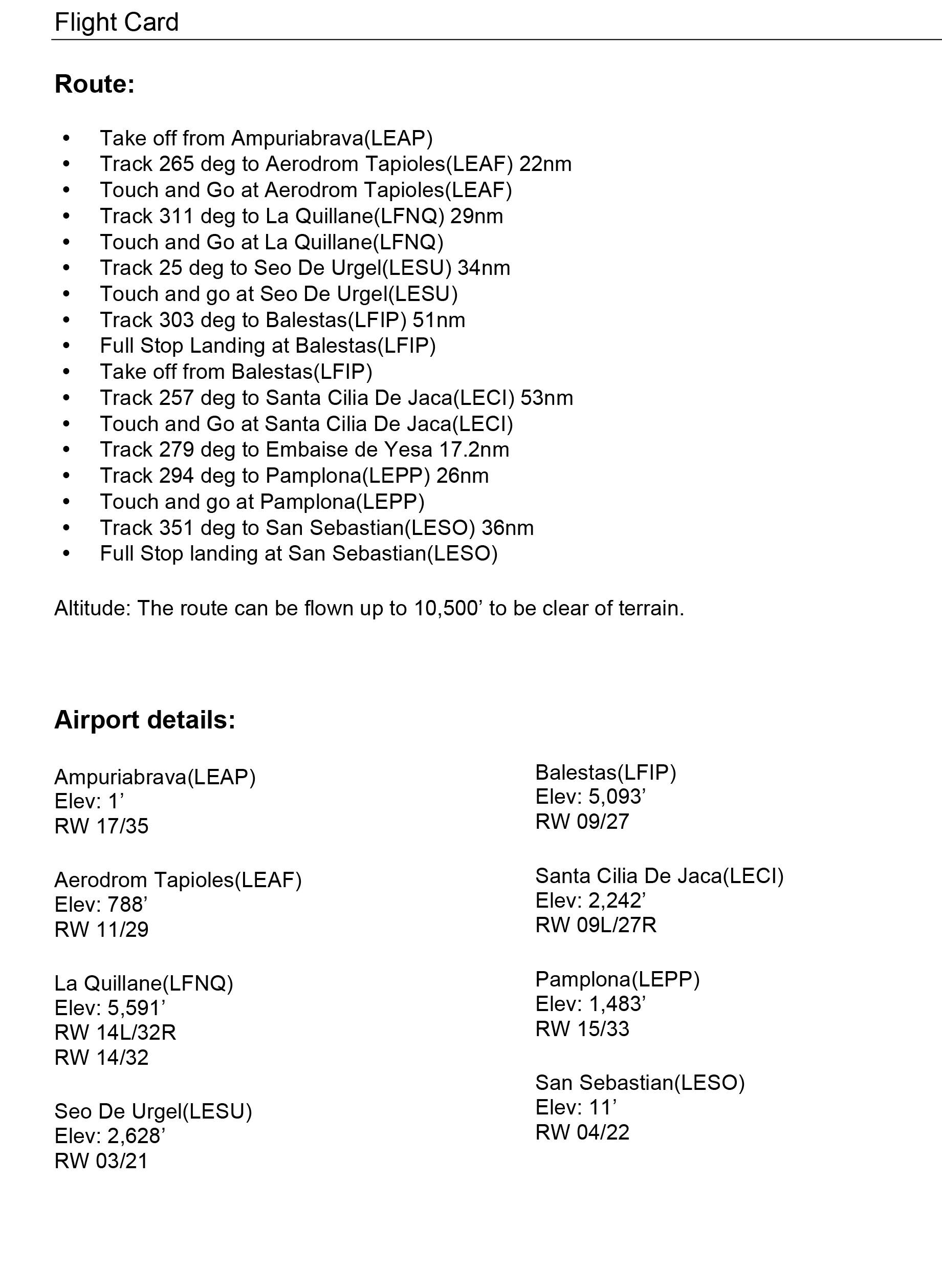 Route: LEAP(Ampuriabrava) - LEAF(Aerodrom Tapioles) - LFNQ(La Quillane) - LESU(Seo De Urgel) - LFIP(Balestas) - LECI(Santa Cilia De Jaca) - Embaise de Yesa - LEPP(Pamplona) - LESO(San Sebastian).
