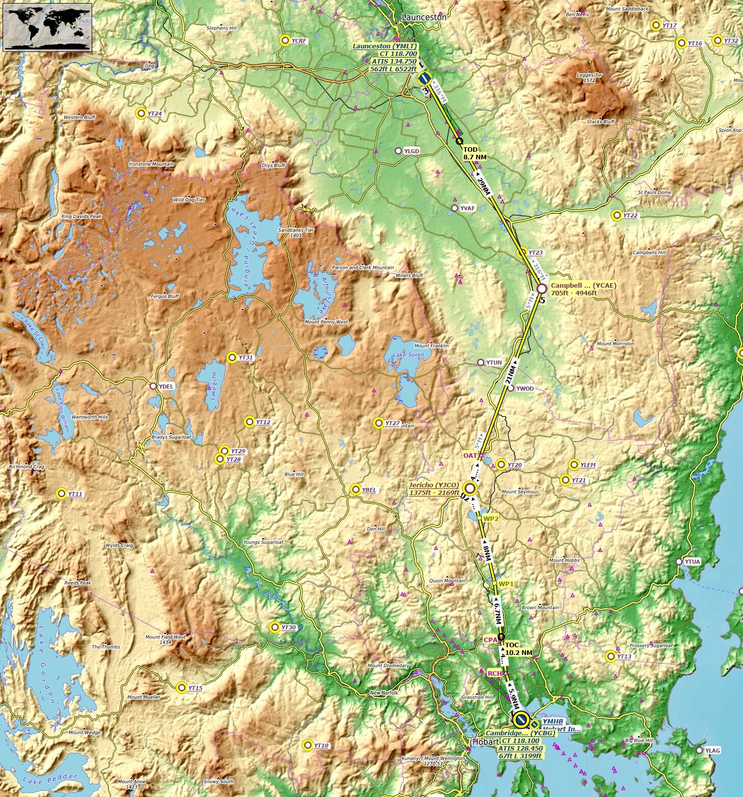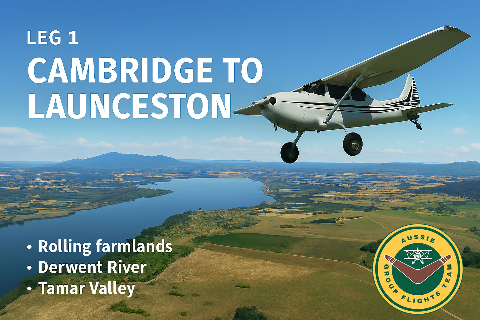 The journey begins in the cool southern reaches of Australia, departing from Cambridge Airport near Hobart and heading north toward Launceston. This gentle warm-up leg offers a scenic introduction to the world tour, with rolling farmland, winding rivers, and the distant outline of Tasmania’s central highlands.