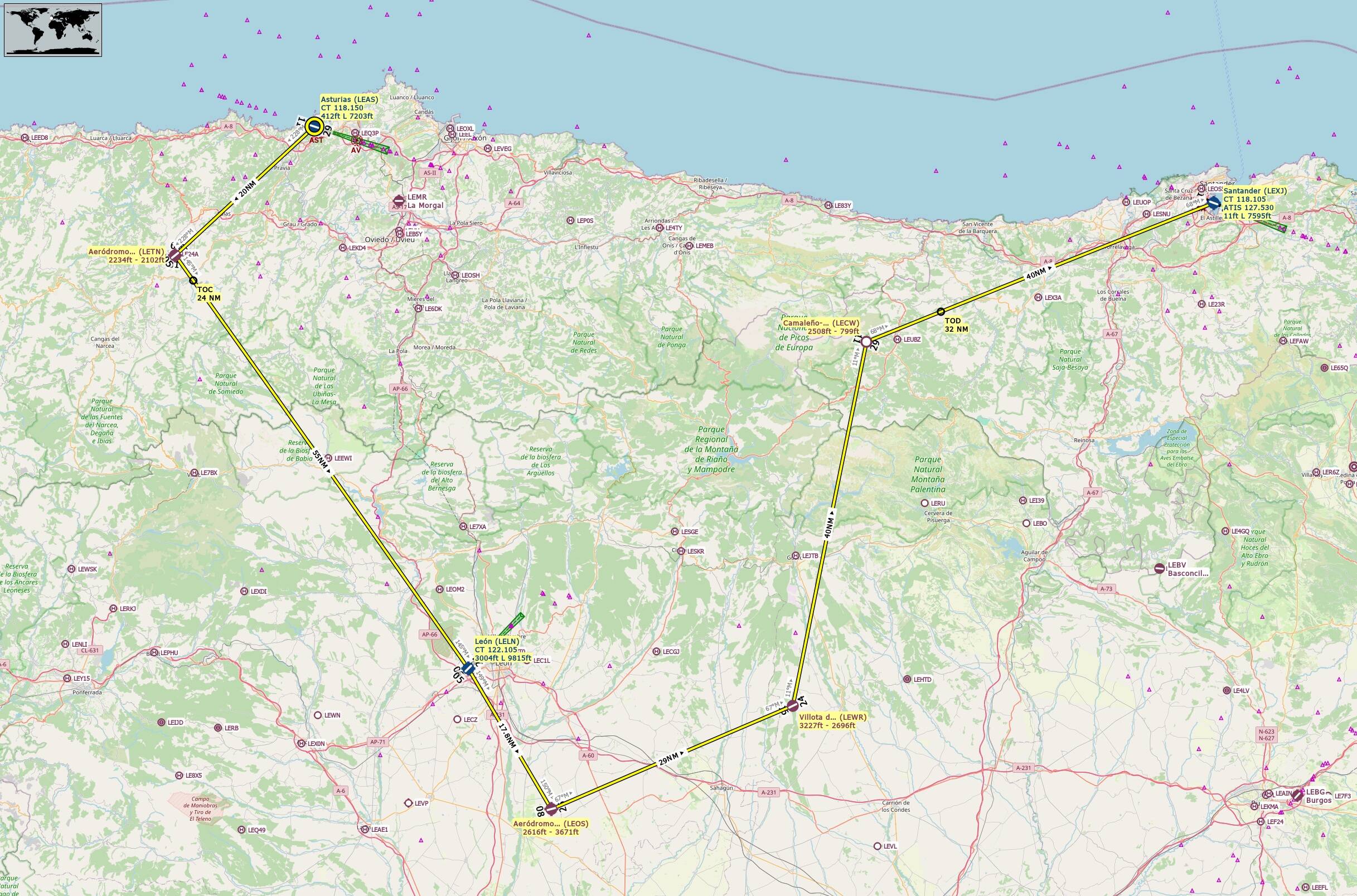 Track 228 deg to Aerodromo de la Curiscada(LETN) 20nm