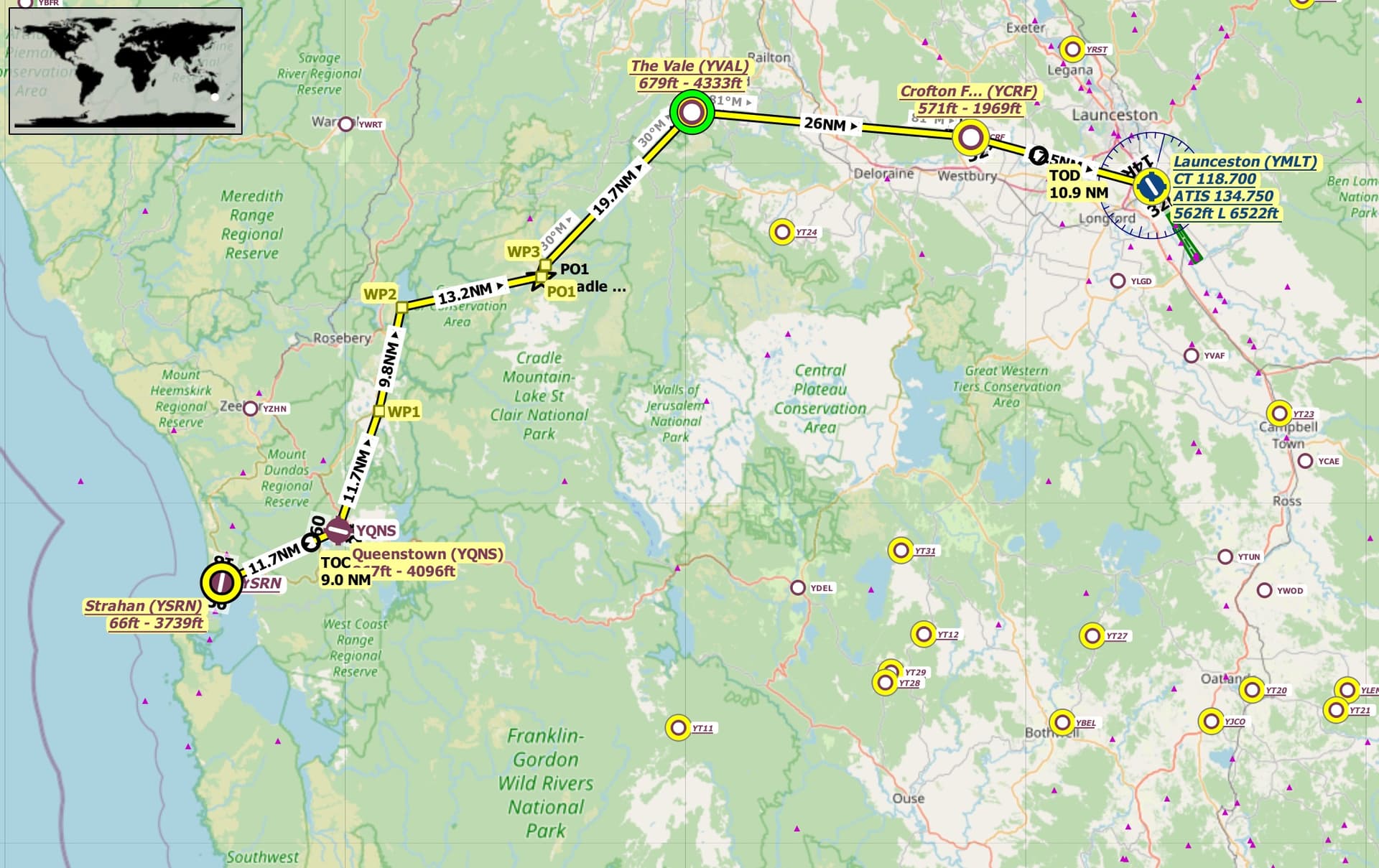 Route: Strahan(YSRN) Queenstown(YQNS) Lake Plimsoll(WP1) Lake Mackintosh(WP2) Cradle Mountain(PO1) Dove Lake(WP3) Sheffield(YSHE) Crofton Farm(YCRF) Launceston(YMLT).