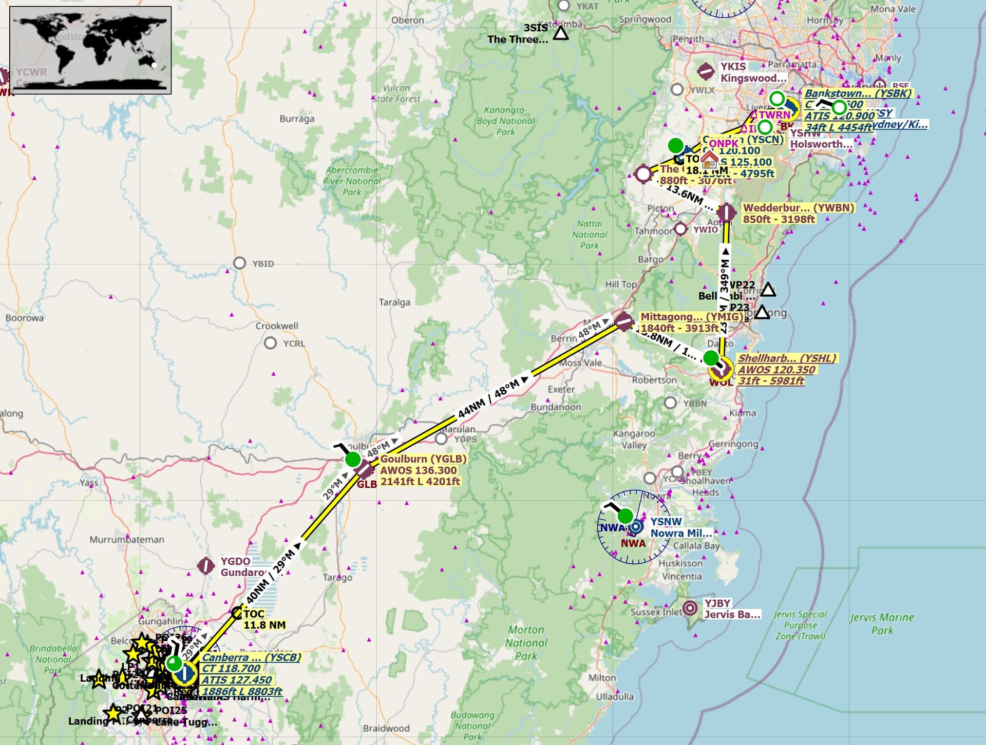 Route: Canberra(YSCB) Goulburn(YGLB) Mittagong(YMIG) Shellharbour(YSHL) Wedderburn(YWBN) The Oaks(YOAS) Camden(YSCN) Oran Park(ONPK) Ingleburn(INGL) Towers(TWRN) Bankstown(YSBK).