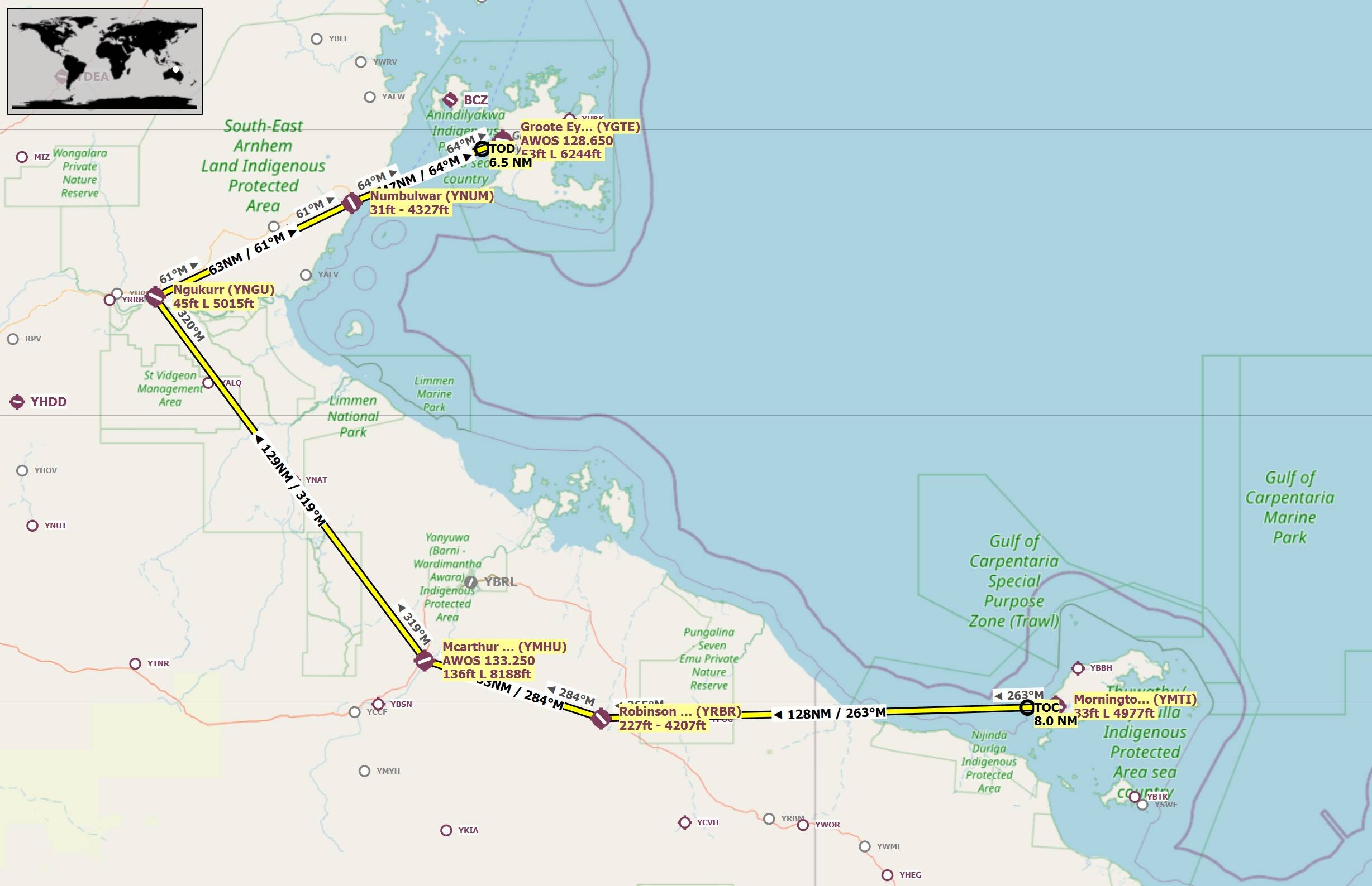 Route: Mornington Is(YMTI) Robinson River(YRBR) Mcarthur River Mine(YMHU) Ngukurr(YNGU) Numbulwar(YNUM) Groote Eylandt(YGTE).