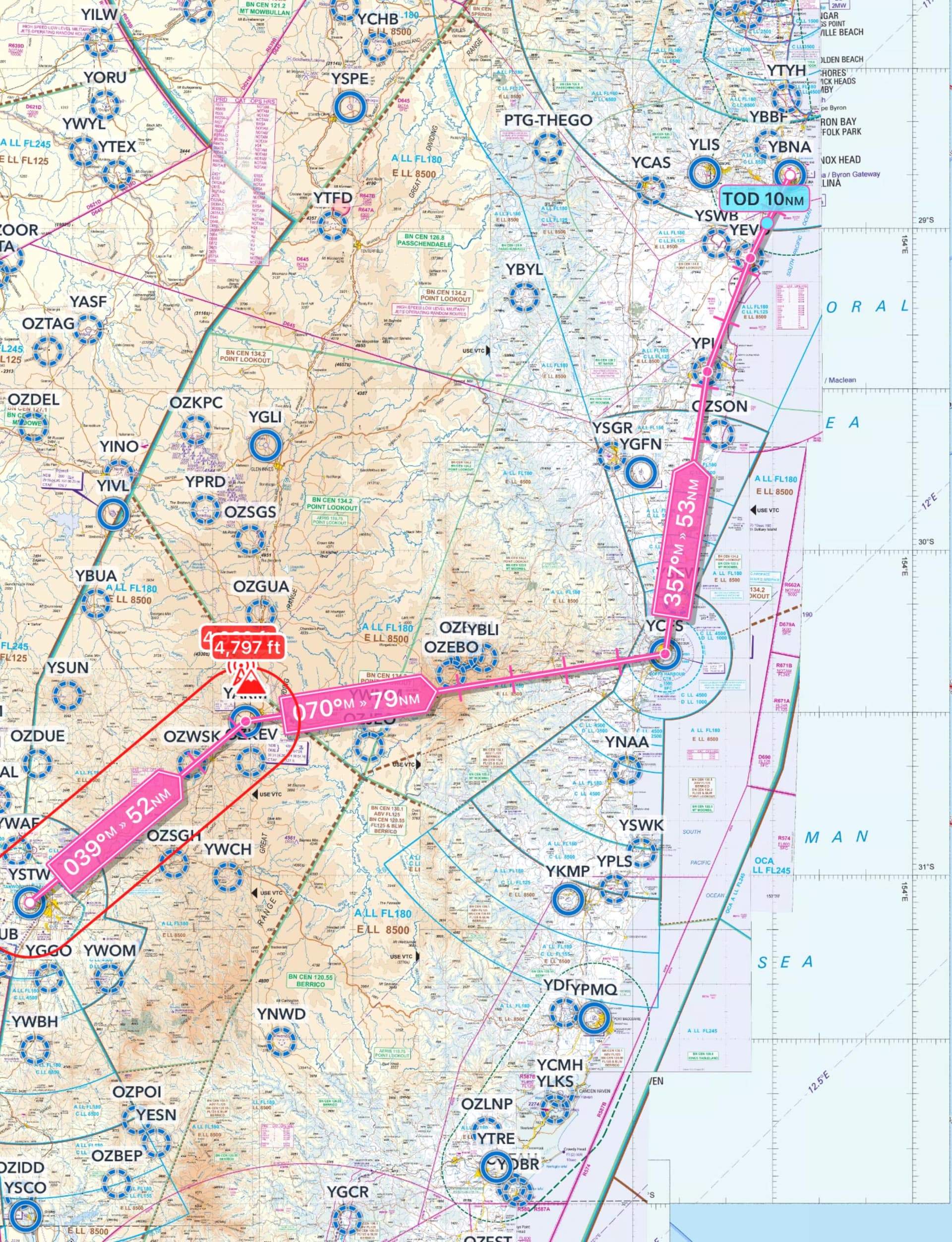 Route: Tamworth(YSTW) - Armidale(YARM) - Coffs Harbour(YCFS) - Palmers Island(YPLI) - Evans Head(YEVD) - Balina(YBNA)