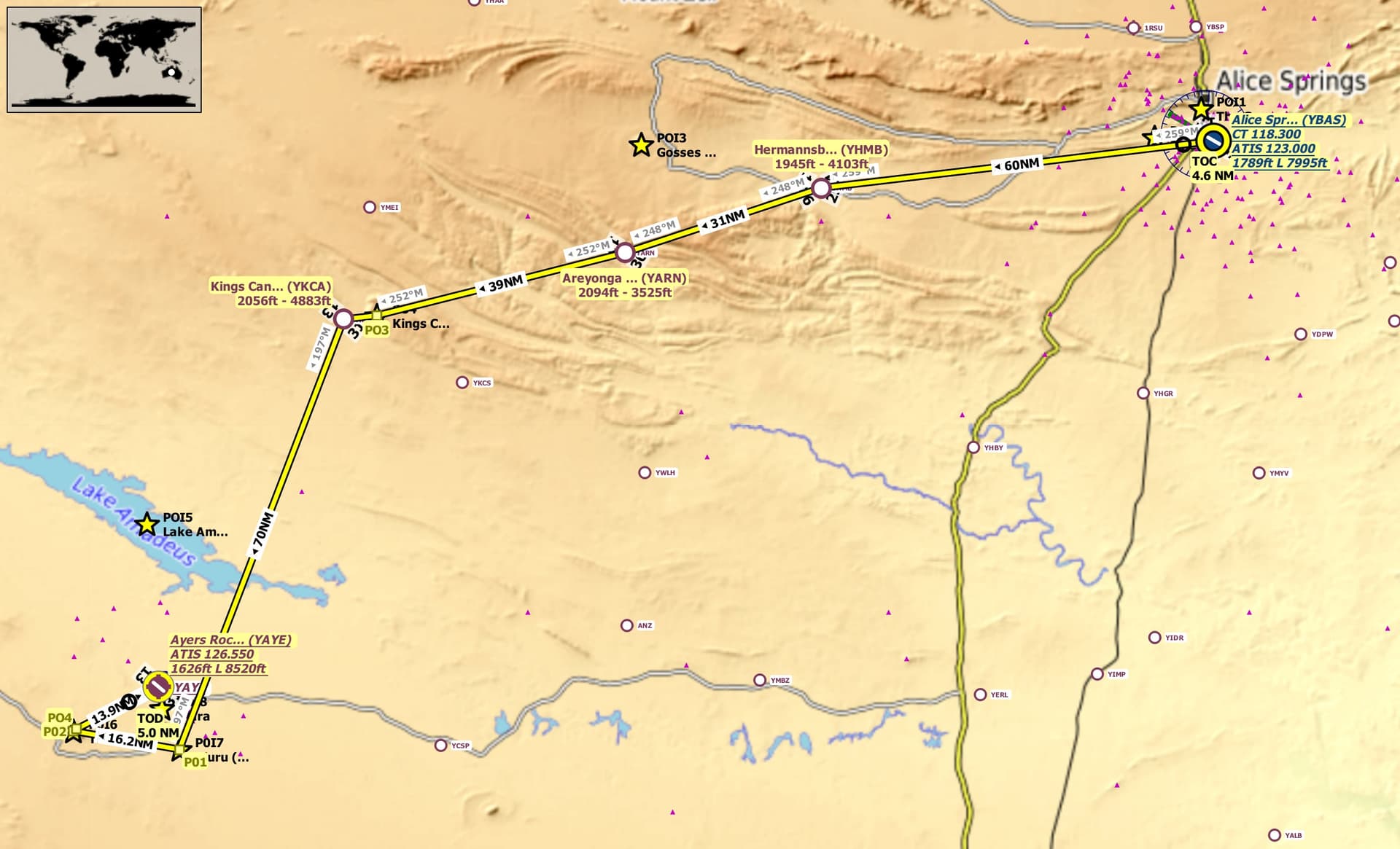 Route: Alice Springs(YBAS) Hermannsburg(YHMB) Areyonga(YARN) Kings Canyon(PO3) Kings Canyon Airport(YKCA) Uluru(Ayers Rock)(PO1) The Olgas(PO2) Valley of the Winds(PO4) Ayers Rock(YAYE).