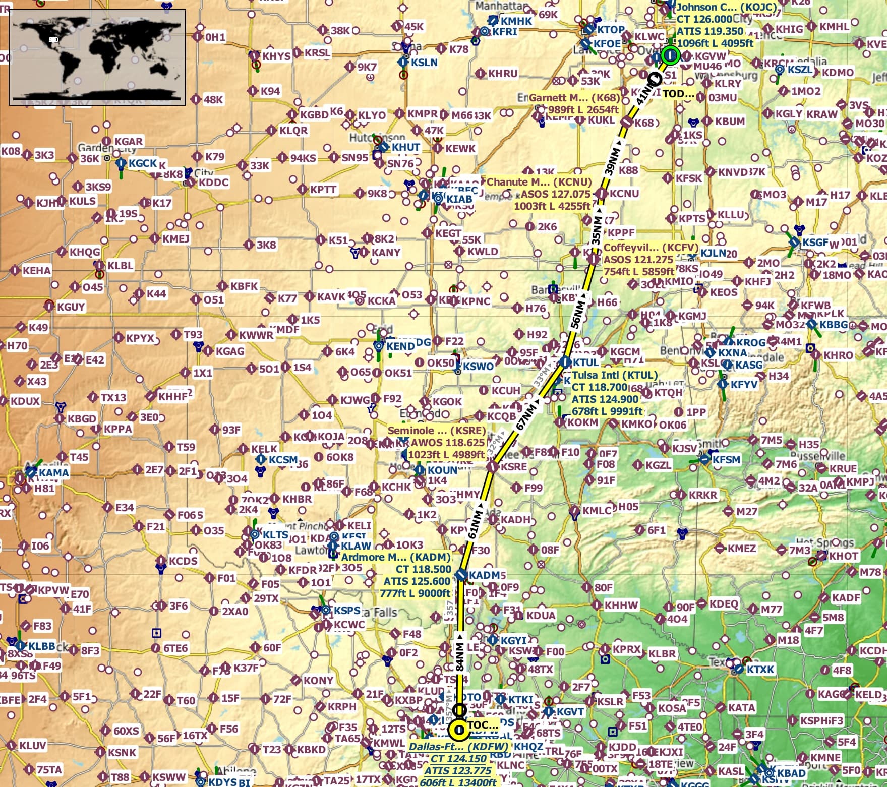 Route: Dallas-Ft Worth Intl(KDFW) Ardmore Mun(KADM) Seminole Mun(KSRE) Tulsa Intl(KTUL) Coffeyville Mun(KCFV) Chanute Martin Johnson(KCNU) Garnett Mun(K68) Johnson County Exec(KOJC).
