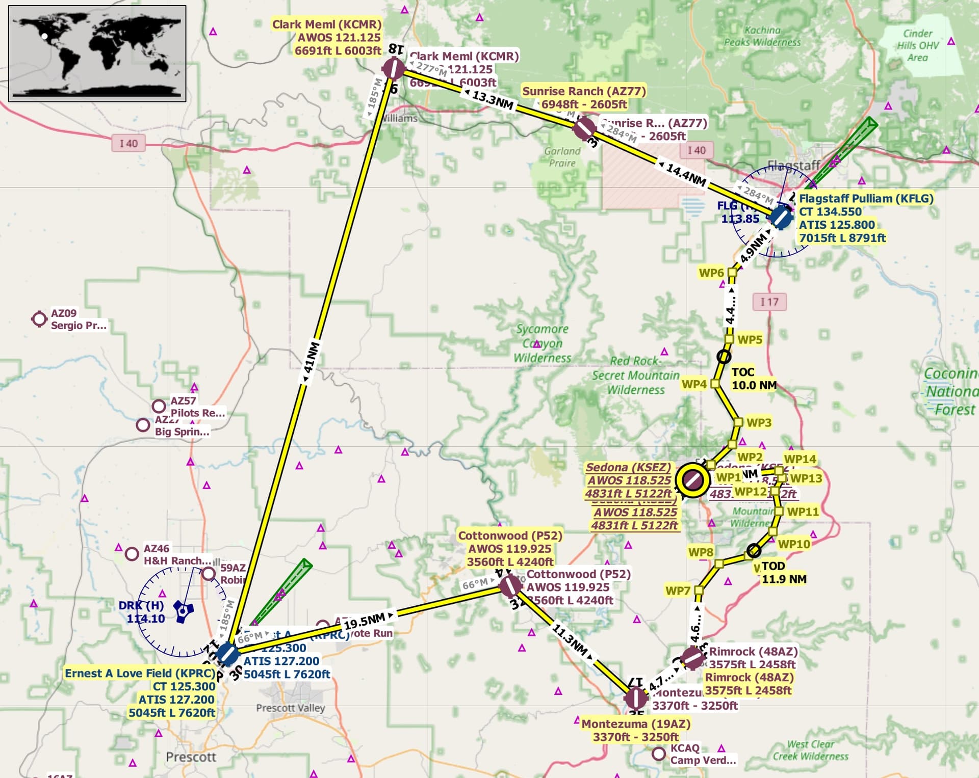Route: Sedona(KSEZ) Flagstaff Pulliam(KFLG) Sunrise Ranch(AZ77) Clark Mem(KCMR) Ernest A Love Field(KPRC) Cottonwood(P52) Montezuma(19AZ) Rimrock(48AZ) Sedona(KSEZ).