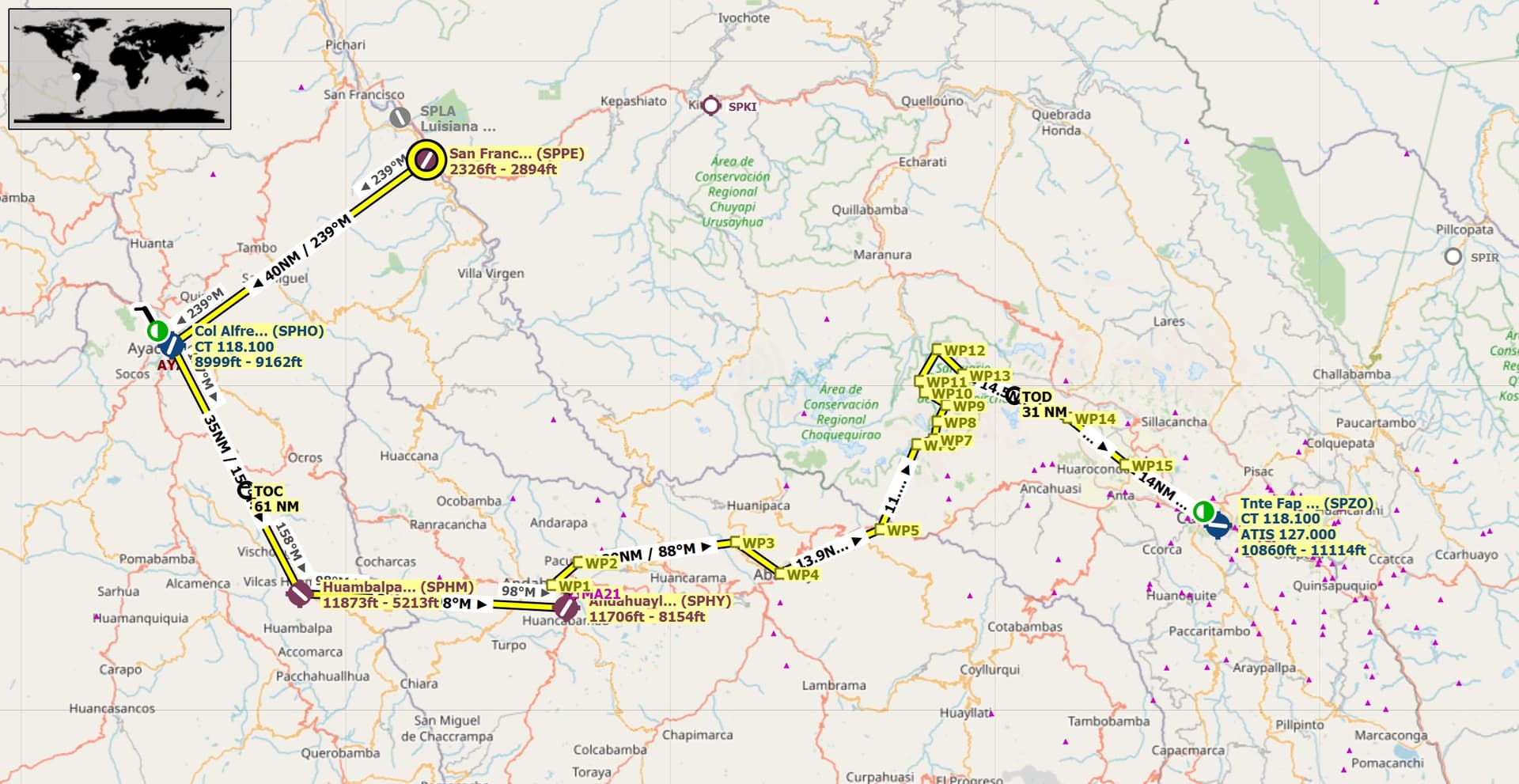 Route: San Francisco(SPPE) Col Alfredo Mandivil Duarte(SPHO) Huambalpa(SPHM) Andahuaylas(SPHY) Tnte Fap Machu Picchu(POI1) Alejandro Velazco Ast(SPZO).