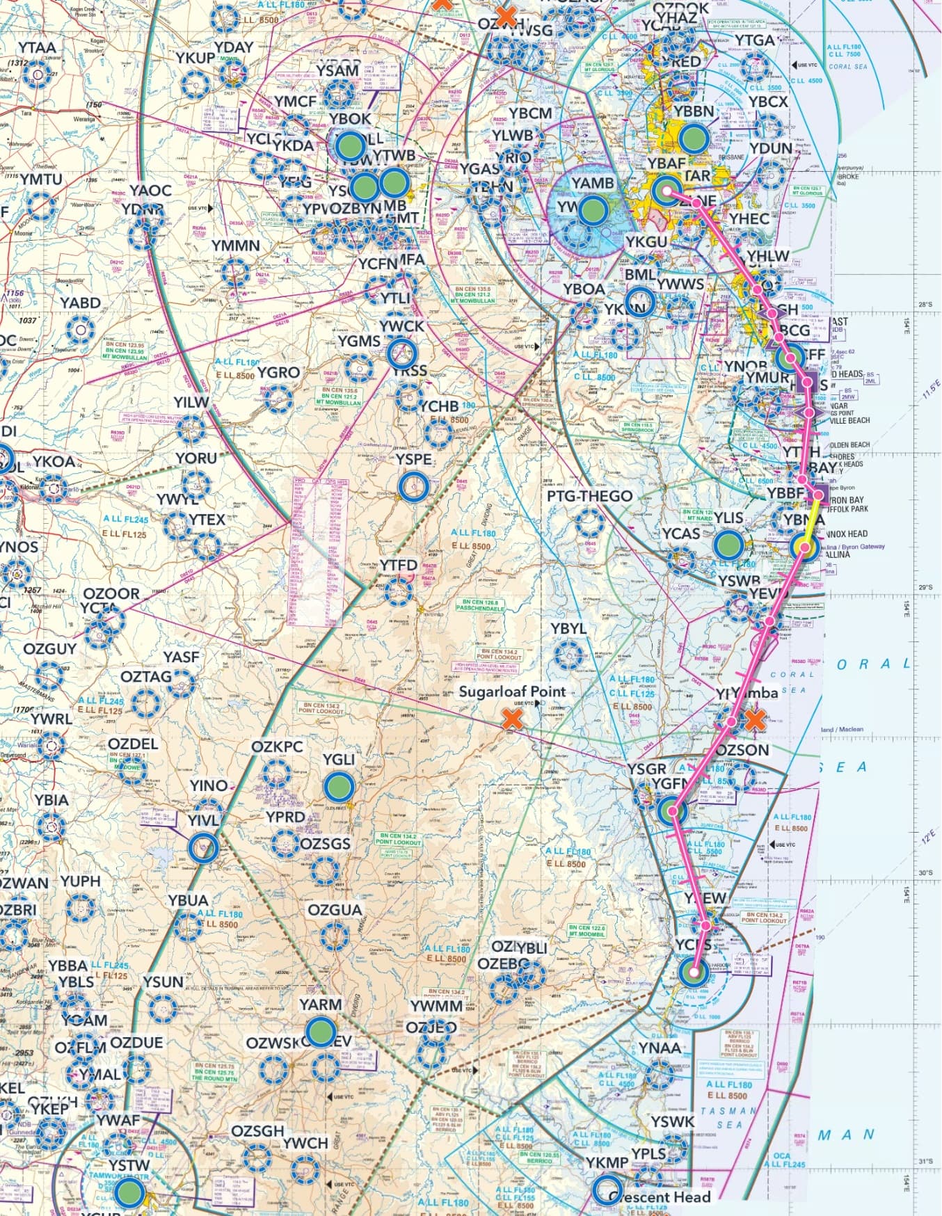 Route: Coffs Harbour(YCFS) Stewarts(YSEW) Grafton(YGFN) Palmers Is(YPLI) Evans Head(YEVD) Ballina(YBNA) Byron Bay(BBAY) Tyagarah(YTYH) Hastings Pt(HASS) Kingscliff(KCFF) Gold Coast(YBCG) Burleigh Head(BLGH) Q1 Bld(Q1) Southport(YSPT) Target(TAR) Archerfield(YBAF).
