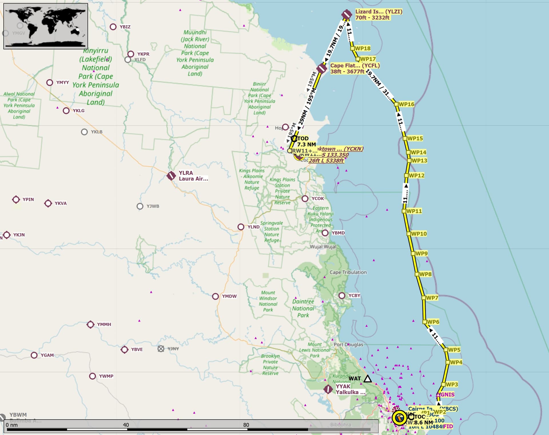 Route: Cairns(YBCS) Cairns City(WP1) False Cape(FCP) Cape Grafton(CGF) Fitzroy Is(FID) Green Is(GNIS) Reef(WP2 - WP17) Lizard Is(YLZI) Cape Flattery(YCFL) Cooktown(YCKN).