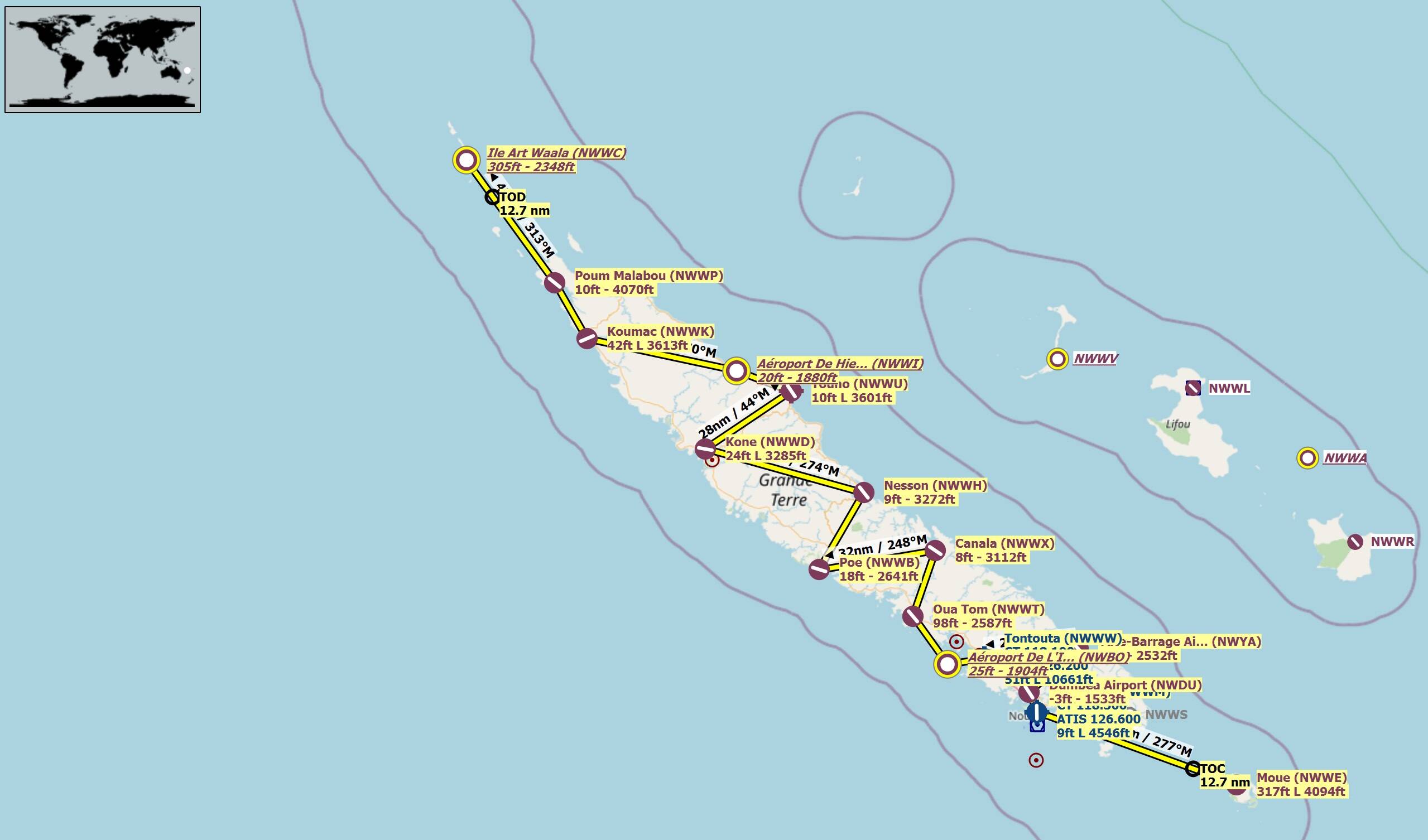 Route: Moue(NWWE) - Magenta(NWWM) - Dumbea(NWDU) - Yate-Barrage(NWDU) - Tontouta(NWWW) - Aeroport De L’Ile D’Hugon(NWBO) - Oua Tom(NWWT) - Canala(NWWX) - Poe(NWWB) - Nesson(NWWH) - Kone(NWWD) - Touho(NWWU) - Aeroport De Hienghene(NWWI) - Koumac(NWWK) - Poum Malabou(NWWP) - Ile Art Waala(NWWC).
