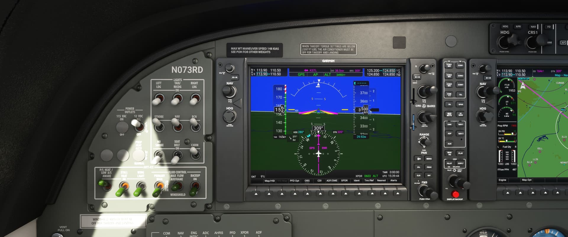If it is just flying off in some direction, the issue may be with just hitting “NAV” on the default 208. With the NXi that is now standard on that plane, keep in mind that it won’t capture the GPS nav line until it’s within about one dot of the course line, meaning you may have to manually (or use heading control) turn toward the desired GPS course line. Note that both heading and NAV buttons are lit because I’m using heading control when I started the flight, and want to use the GPS nav selection. The “GPS” will show in white text (meaning it’s armed and will activate when within parameters), but you’ll continue to fly in accordance with whatever lateral guidance currently set (HDG, ROLL…) in green text, and you’ll just keep flying off in that direction without regard to your GPS line.