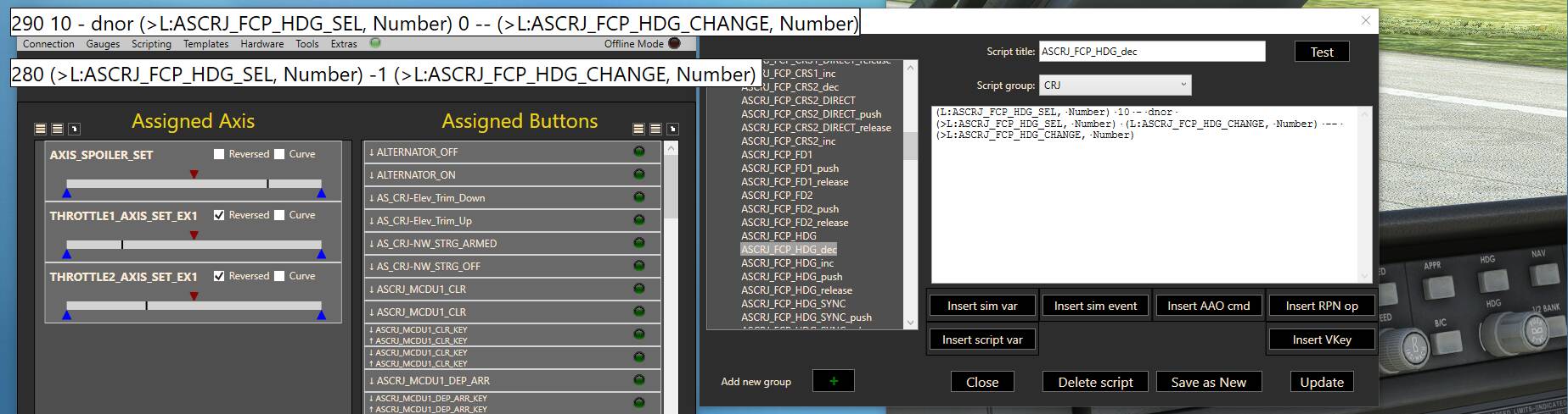 However, when I turn the knob in the sim, I can see the values changing (see the result after 2 decrease clicks in the sim below), so the LVARs seem to the correct. For some reason the knobs are not reacting to the script.